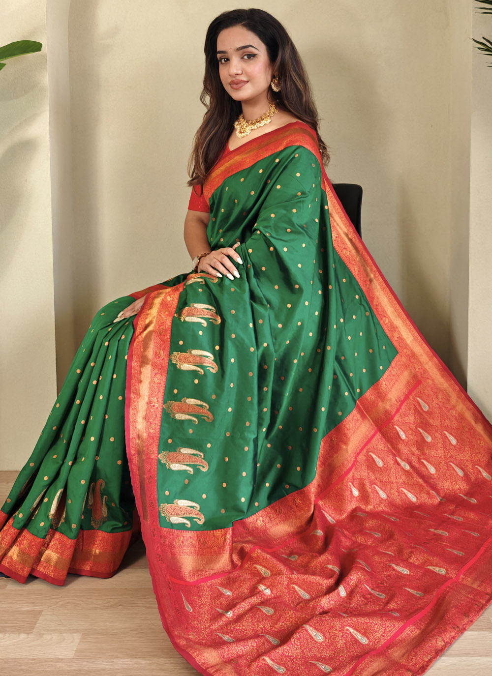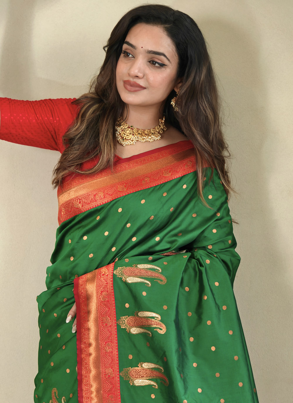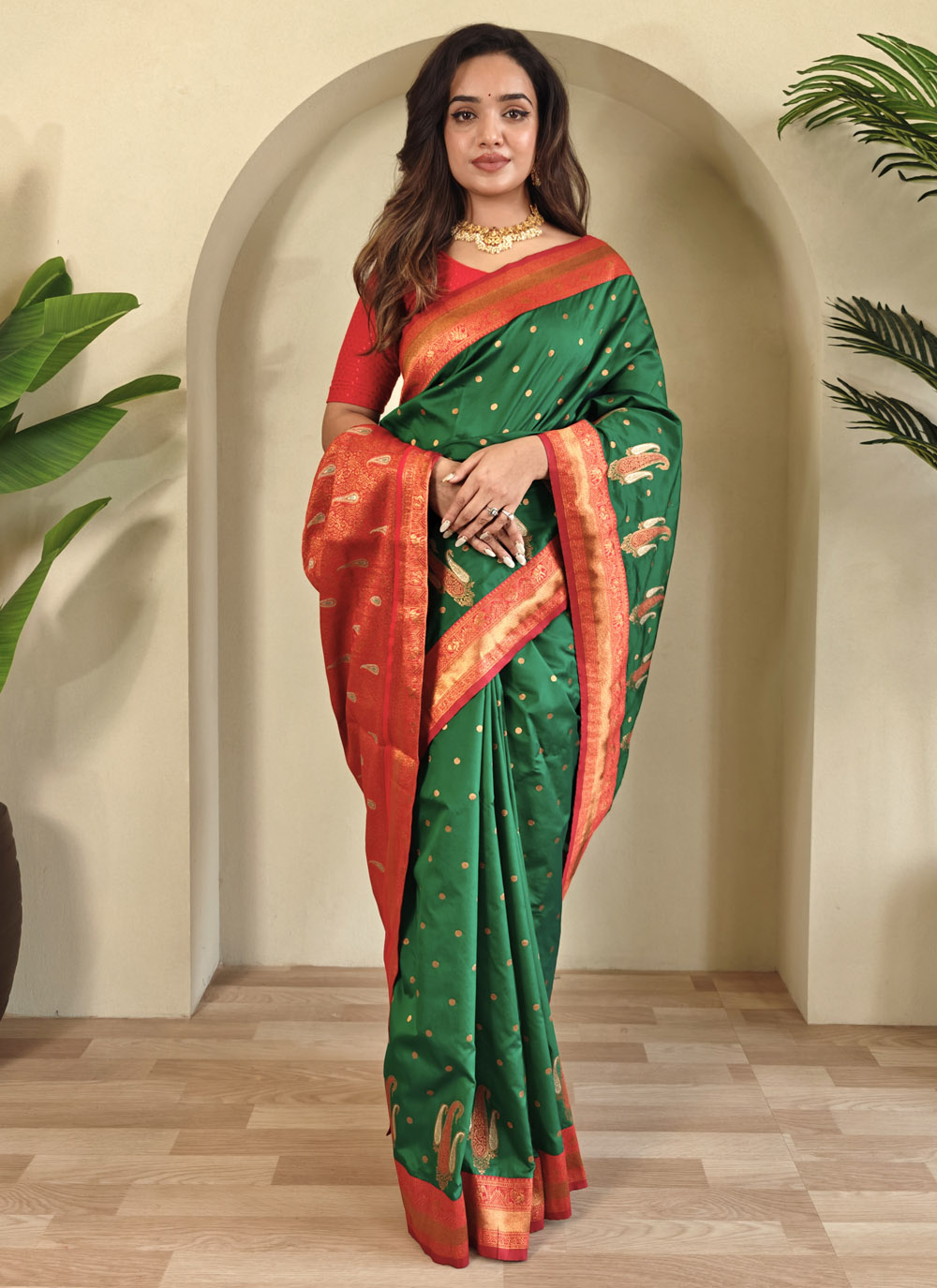 Celebrate tradition with grace wearing this Green Paithani Silk Saree, beautifully adorned with intricate weaving work. Crafted for ceremonial occasions, its rich silk fabric, classic motifs and texture make it a timeless choice for weddings, religious functions, and family gatherings. Comes with matching blouse.