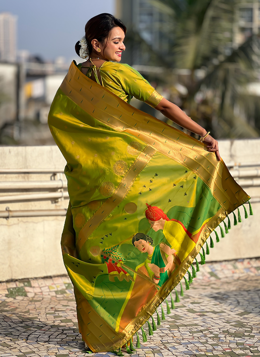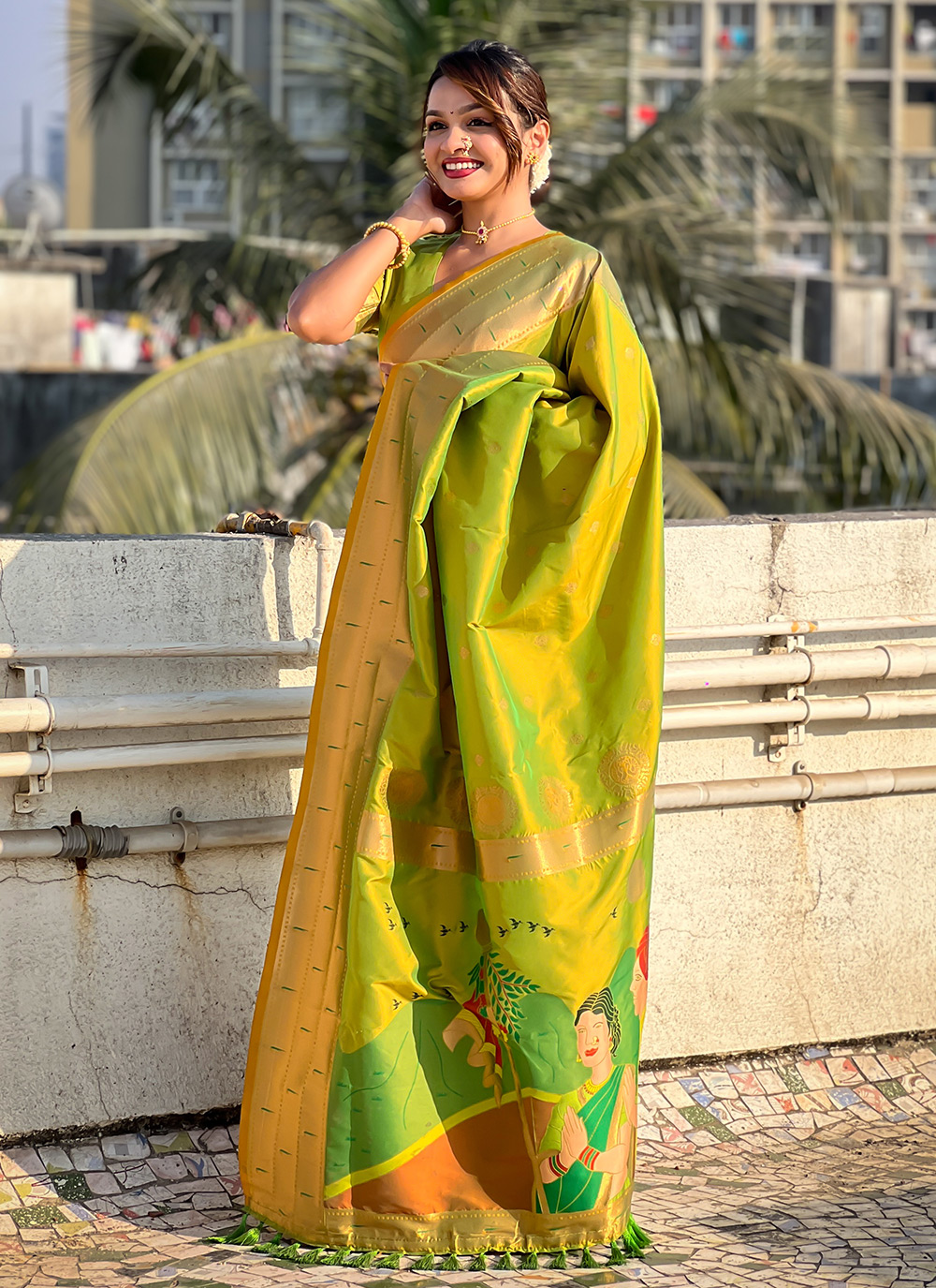 The Weaving Silk Green Trendy Saree, with a matching blouse, combines traditional craftsmanship with modern design. The vibrant green color and intricate weaving make it a popular choice for weddings and festive occasions, offering a blend of elegance and contemporary style.