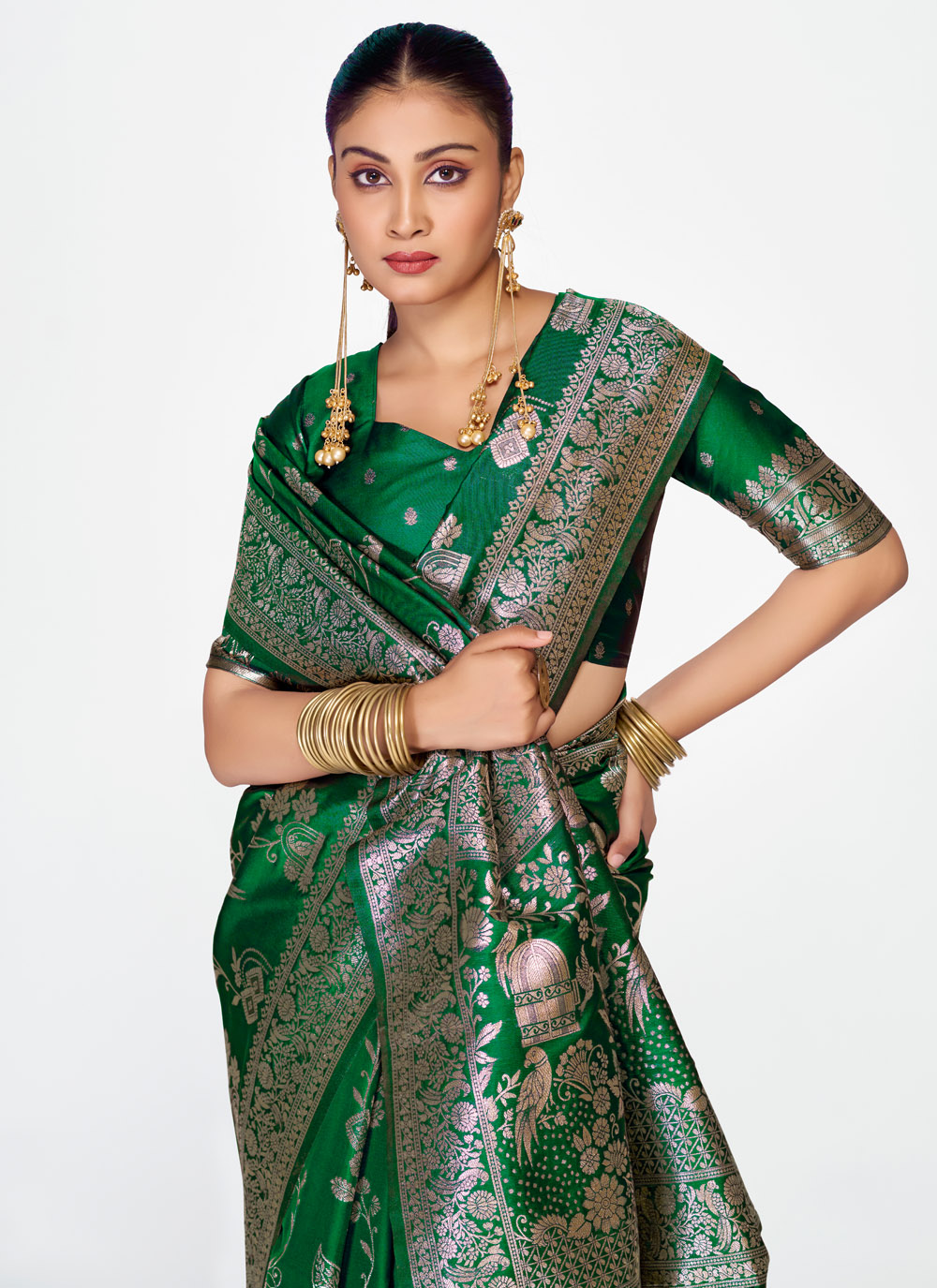 Designed with classic elegance, this traditional Banarasi silk saree in green showcases refined weaving patterns. The smooth silk drape and rich color bring sophistication to festive and wedding wear. Comes with matching blouse.