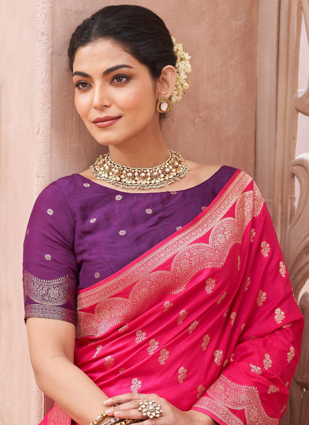 This rani viscose ceremonial saree showcases beautiful woven patterns that highlight fine craftsmanship and traditional artistry. The vibrant rani shade adds a bold and graceful presence. Comes with matching blouse.