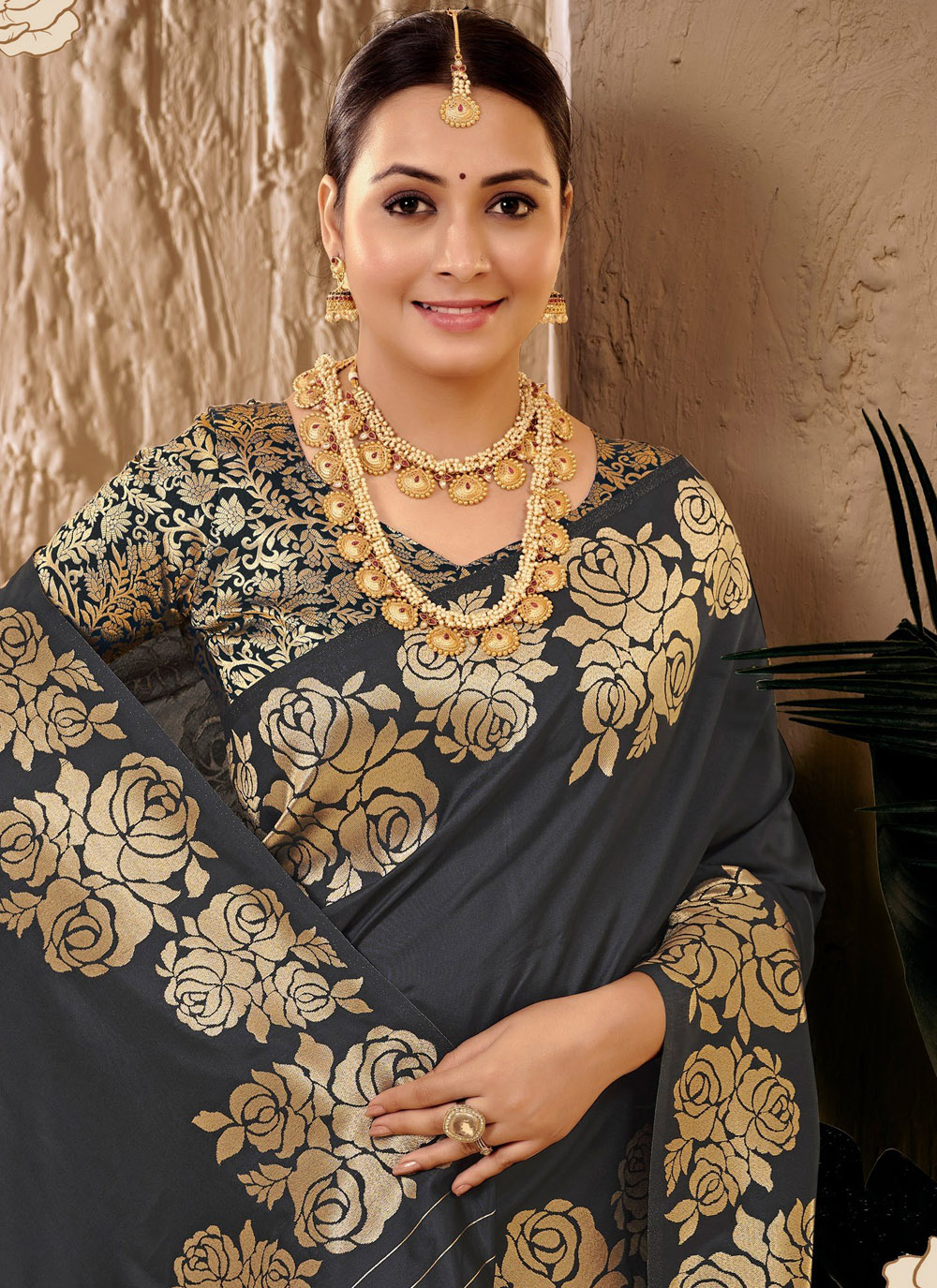 Upgrade your ethnic collection with this black Banarasi silk saree featuring intricate zari woven detailing. The premium fabric ensures a flattering drape, while the traditional design offers lasting elegance. Comes with matching blouse.