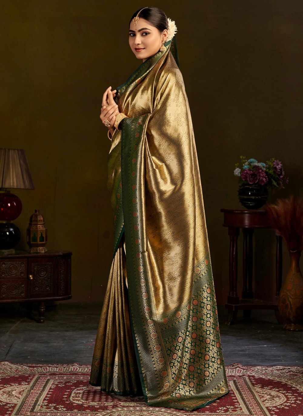 Designed for grand celebrations, this green designer saree features shimmering zari work that enhances its depth and elegance. The vibrant tone paired with classic weaving makes it a versatile choice. Comes with matching blouse.