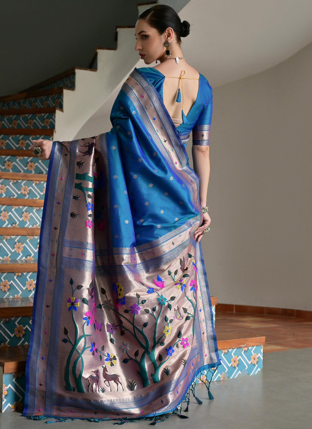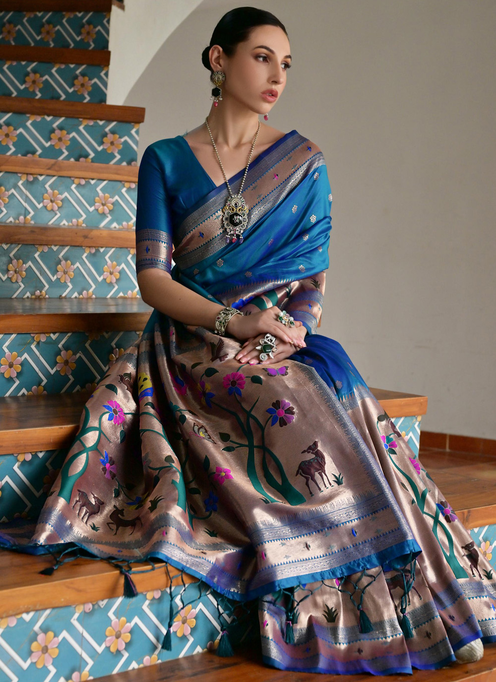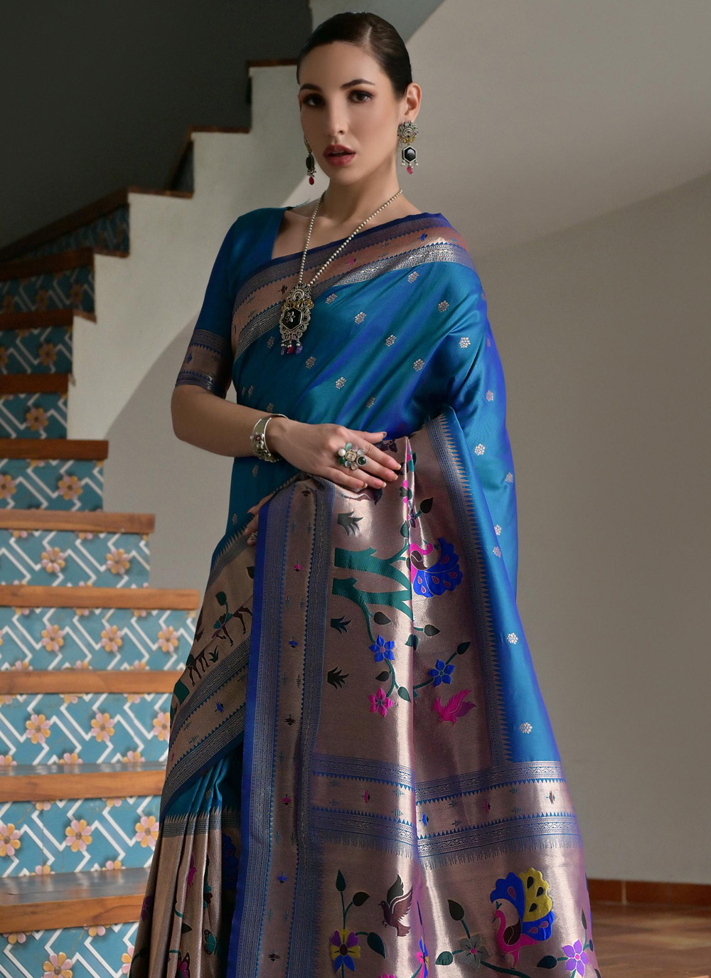 Add royal charm to your ethnic wardrobe with this navy blue Banarasi silk trendy saree. The zari weaving work and premium silk fabric offer a graceful drape and a sophisticated festive look. Comes with matching blouse.