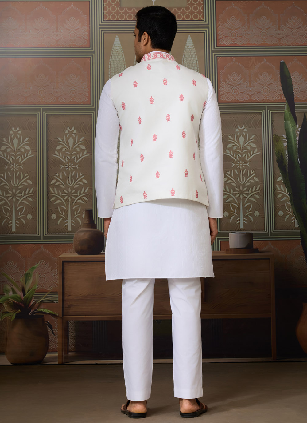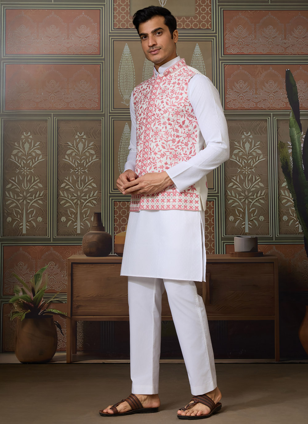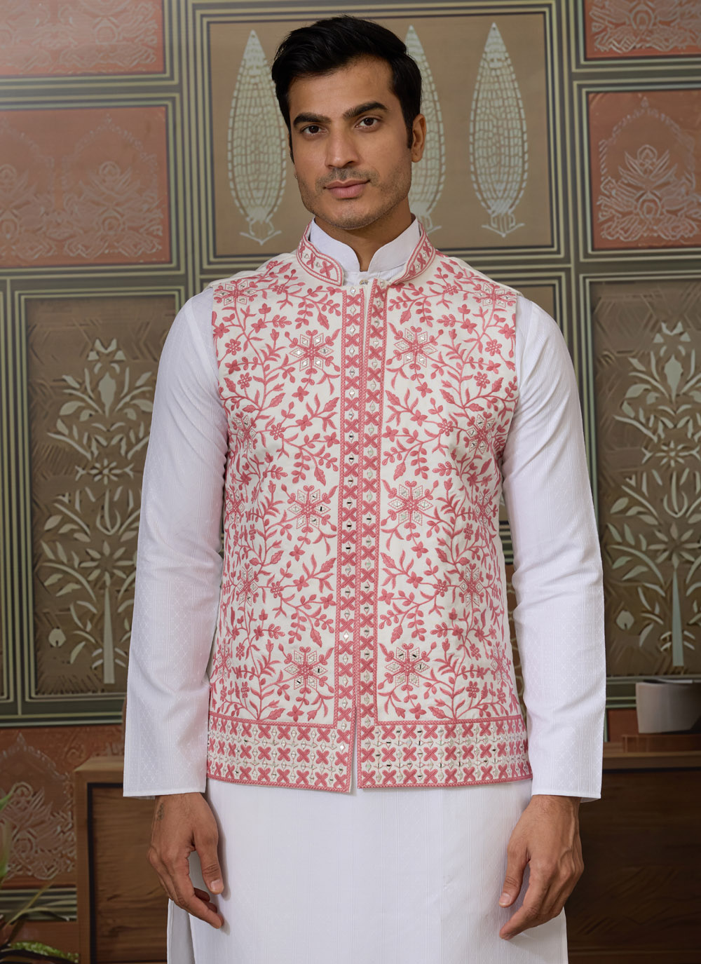 Elevate your ethnic wardrobe with this silk kurta pajama and jacket combo in soothing white and pink shades. Adorned with intricate mirror thread embroidery, the ensemble blends tradition with a modern touch, making it a great choice for groomsmen or festive occasions.