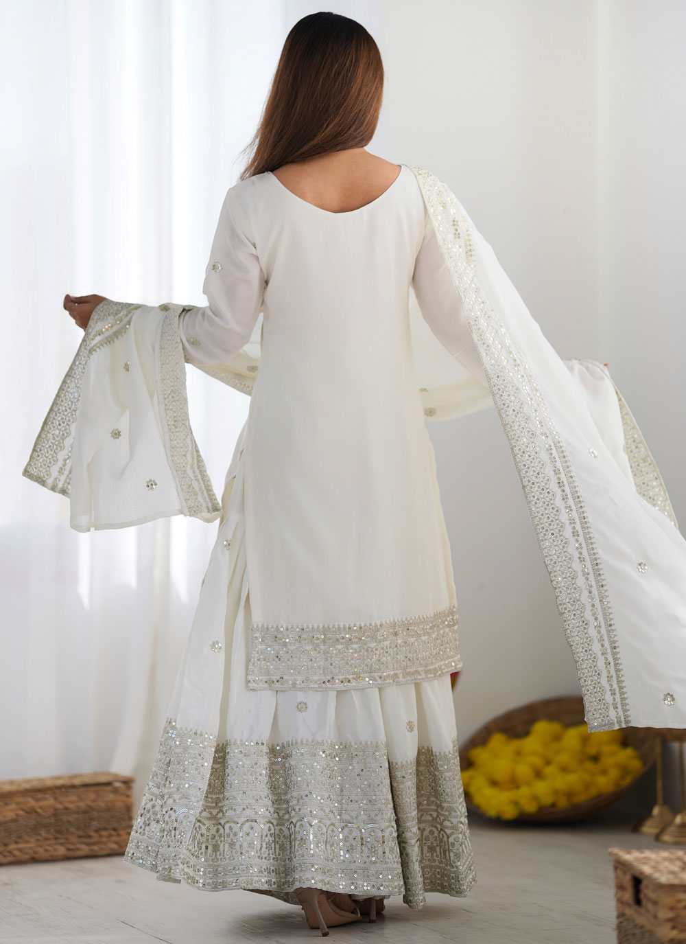 Elegant and stylish, the White Chinon Silk Embroidered Sequins Palazzo Salwar Kameez features detailed embroidery and shimmering sequins. It includes a matching bottom and dupatta, ideal for weddings and festive occasions.
