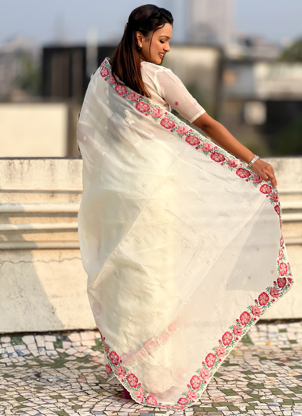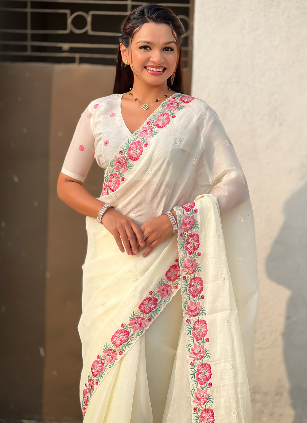 This embroidered white crush silk saree blends modern design with classic charm. The intricate cut work detailing enhances its beauty, making it suitable for festive and formal events. Comes with matching blouse.
