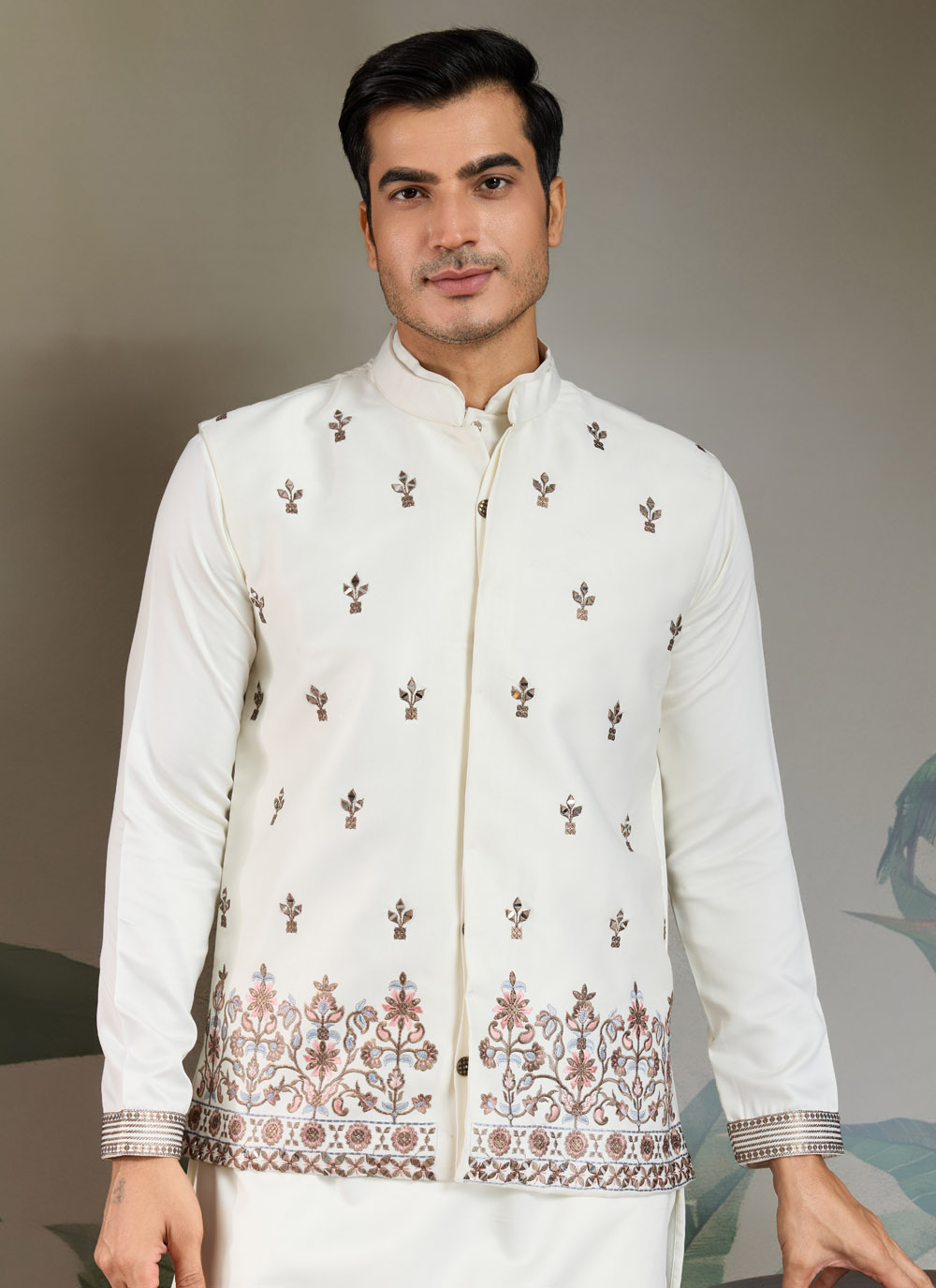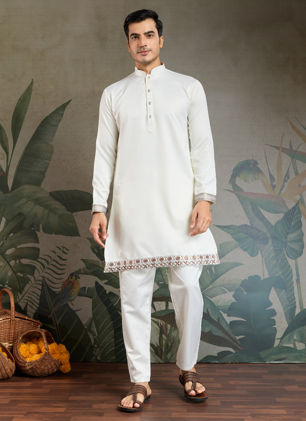 This White Embroidered Kurta Pajama crafted in fine silk is paired with a beautifully detailed jacket that adds a royal edge. A must-have outfit for men who want a classy and graceful look at celebrations and ceremonies.