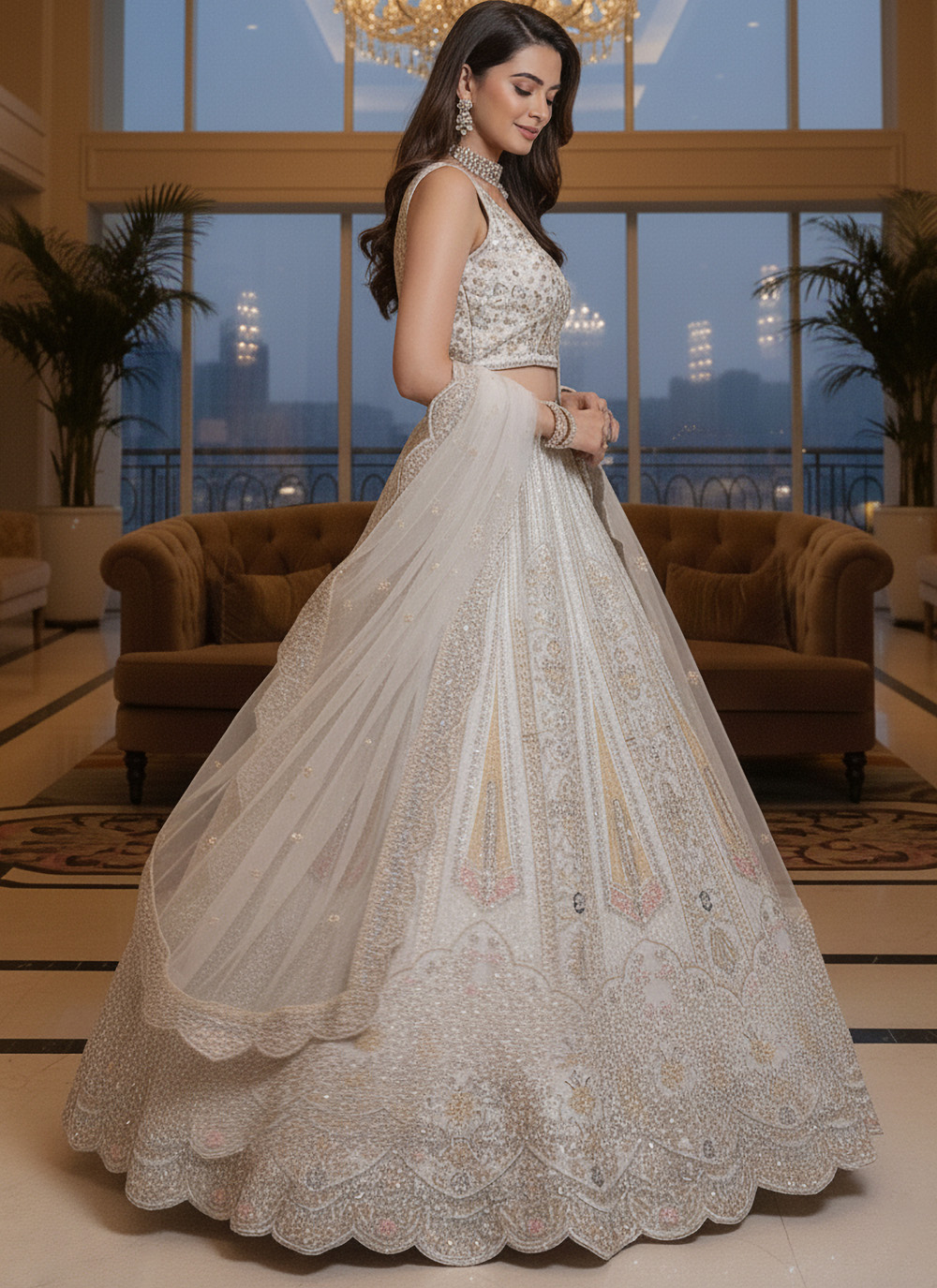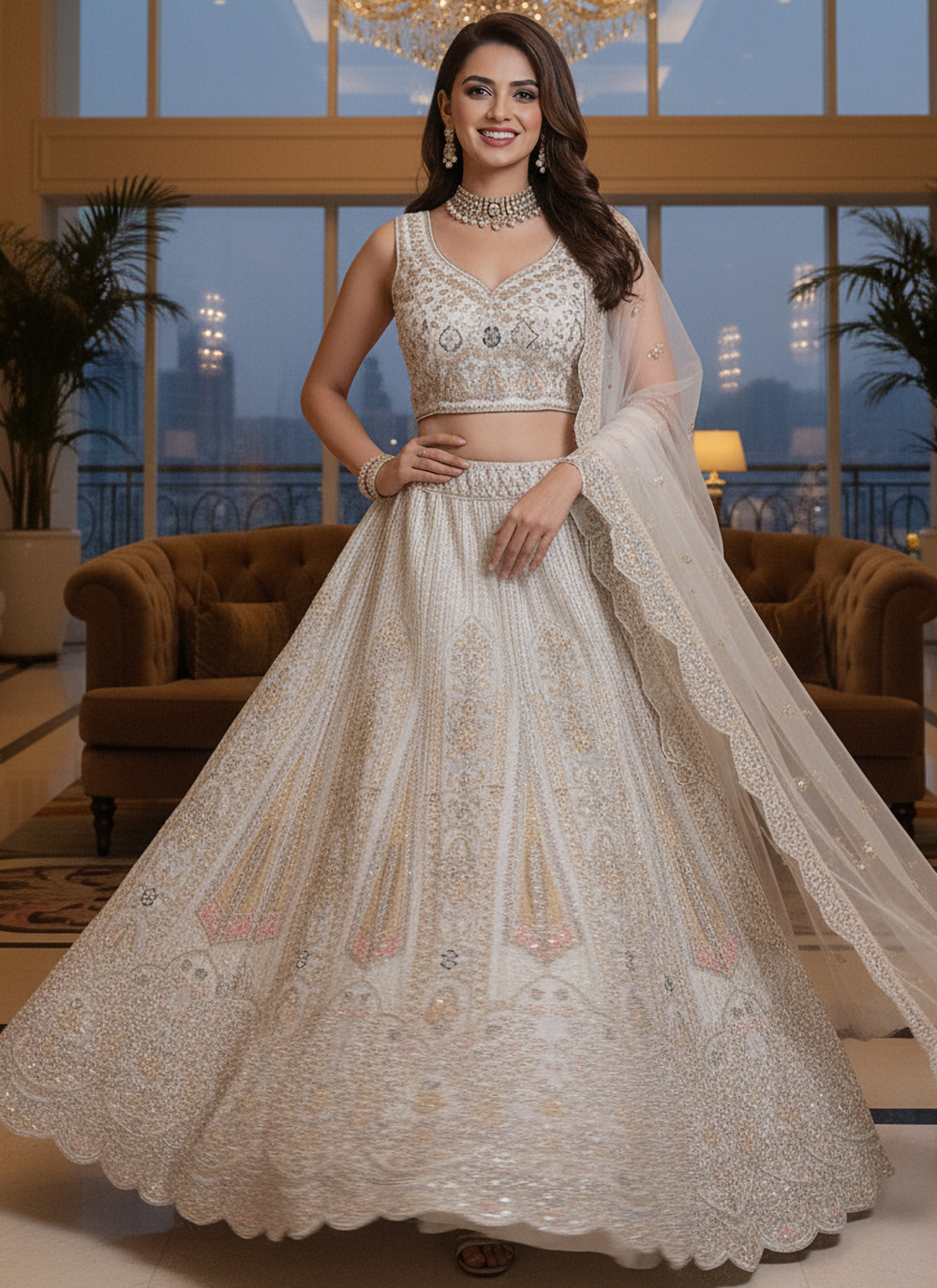 This white net lehenga choli is designed for women who appreciate refined ethnic fashion. The harmonious blend of sequins, zarkan stones, dori embroidery, and zari threads creates a visually stunning outfit that feels both graceful and modern. Comes with matching choli and dupatta.