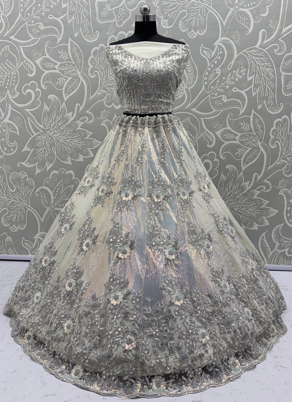 This white net lehenga choli is adorned with detailed zarkan, thread, and multi-sequins embroidery, complemented by shimmering diamond dori work. Its flowing silhouette and delicate embellishments make it a standout choice. Comes with matching choli and dupatta.
