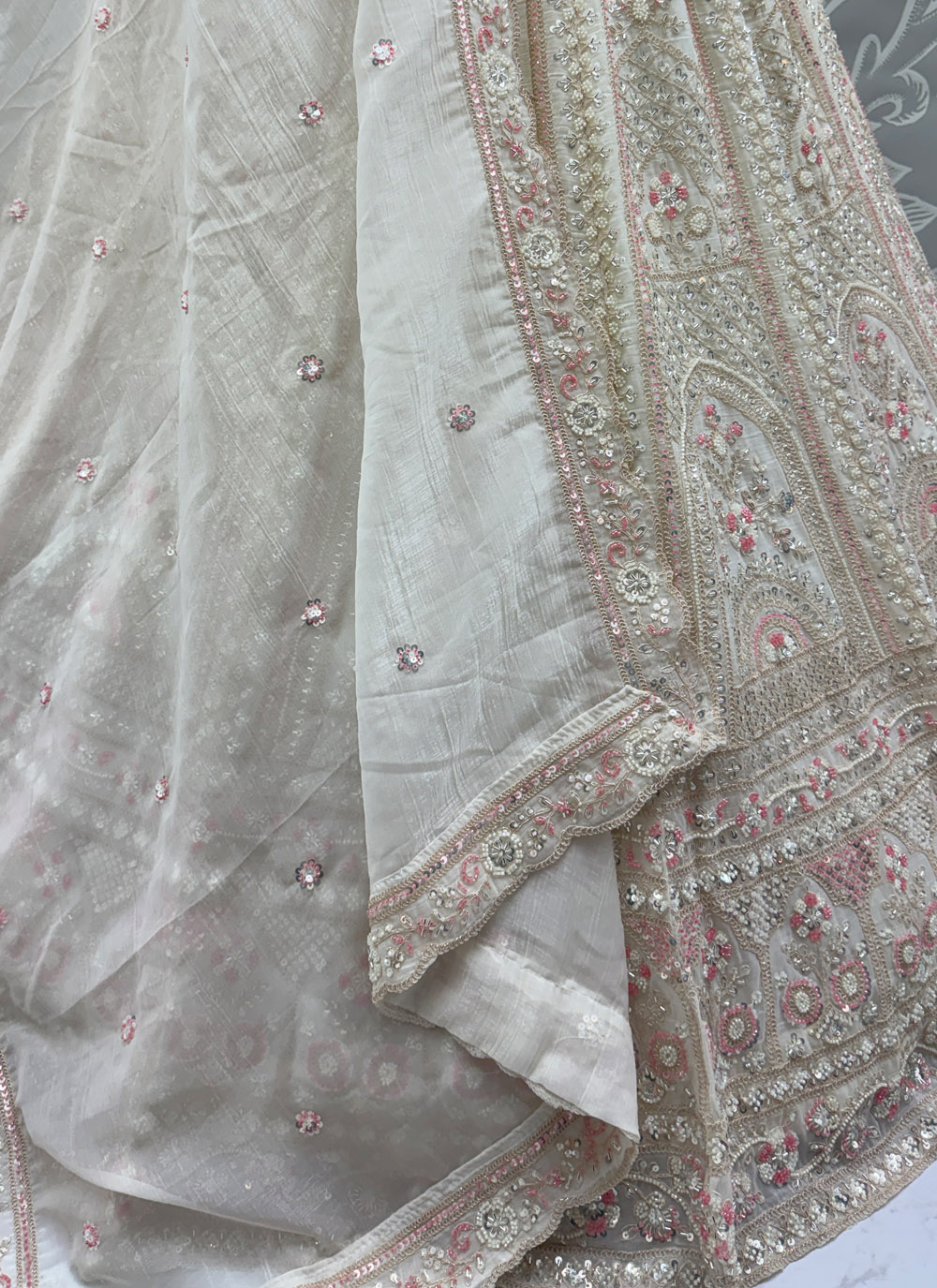 This White Satin Dori Sequins Stone Embroidered Lehenga Choli is designed for women who love elegance with a modern touch. The fine embroidery stands out gracefully on the pristine white base, making it ideal for bridal events and festive occasions. Comes with matching choli and dupatta.