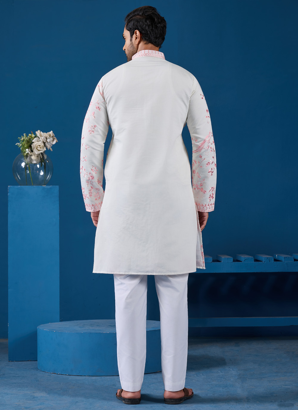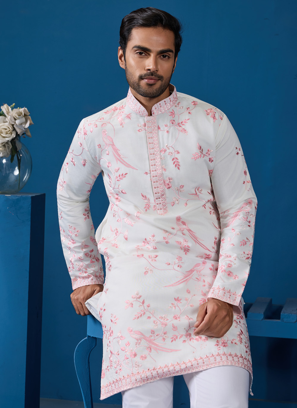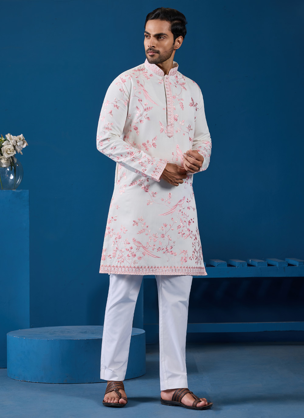 This white viscose designer kurta brings together fine sequins detailing and elegant threadwork for a refined festive look. Its subtle shimmer gives you a polished presence without overpowering your style.