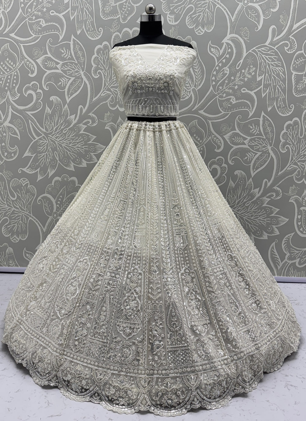 Elevate your ethnic charm with this stunning white lehenga choli crafted in fine fabric. Decorated with sequins, beads, cutdana and intricate thread embroidery, it blends sophistication with contemporary elegance. Comes with matching choli and dupatta.