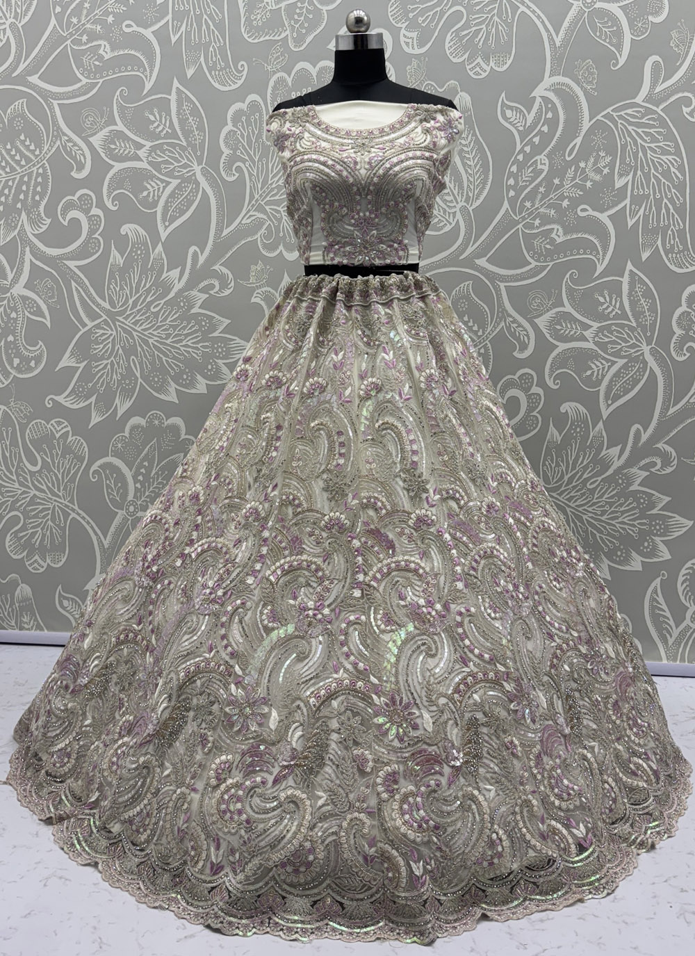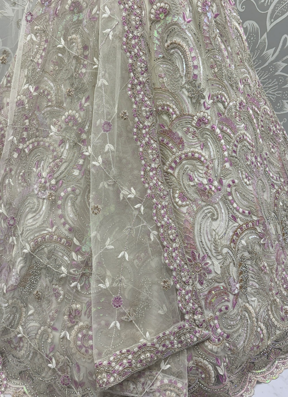 This white designer lehenga choli embodies timeless elegance with its A-line cut and embroidery. Richly decorated with sequins, zari, multi-thread and dori work, it is further elevated with sparkling zarkan diamond highlights that catch the light beautifully. perfect choice for weddings, sangeet or celebrations. Comes with matching choli and dupatta.