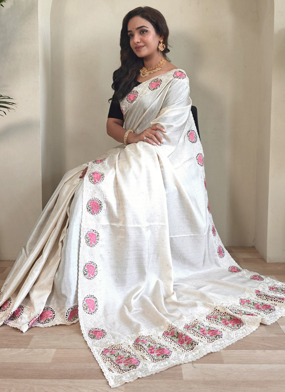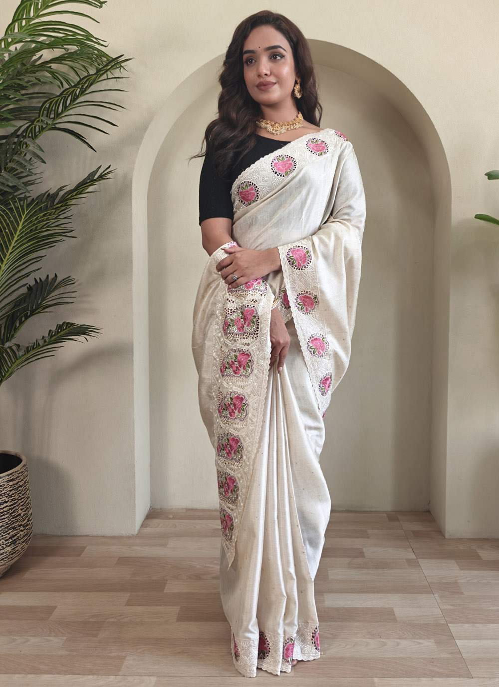 Let your style speak volumes in this serene white embroidered Tussar saree. Its cut work detailing and breathable silk fabric offer comfort and class for both traditional rituals and contemporary occasions. Comes with matching blouse.