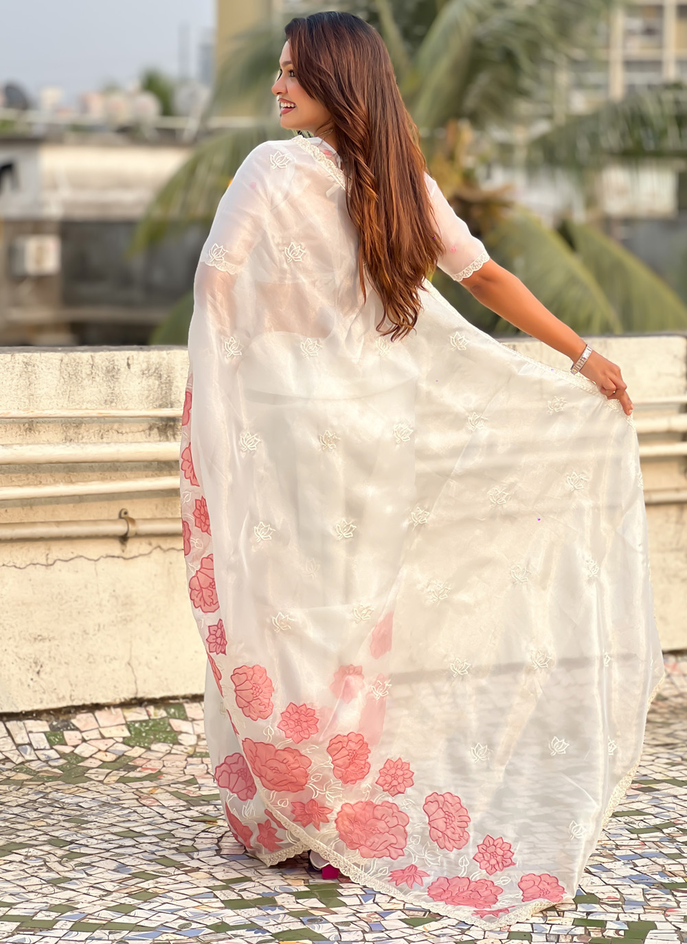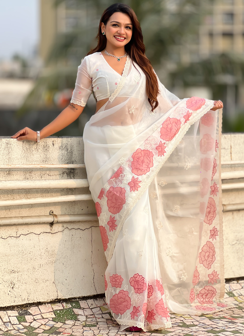 An exquisite White Silk Saree featuring elegant embroidery that blends harmoniously with intricate cut work borders. The silk texture and sophisticated design create a timeless ethnic outfit ideal for ceremonial wear. Comes with matching blouse.
