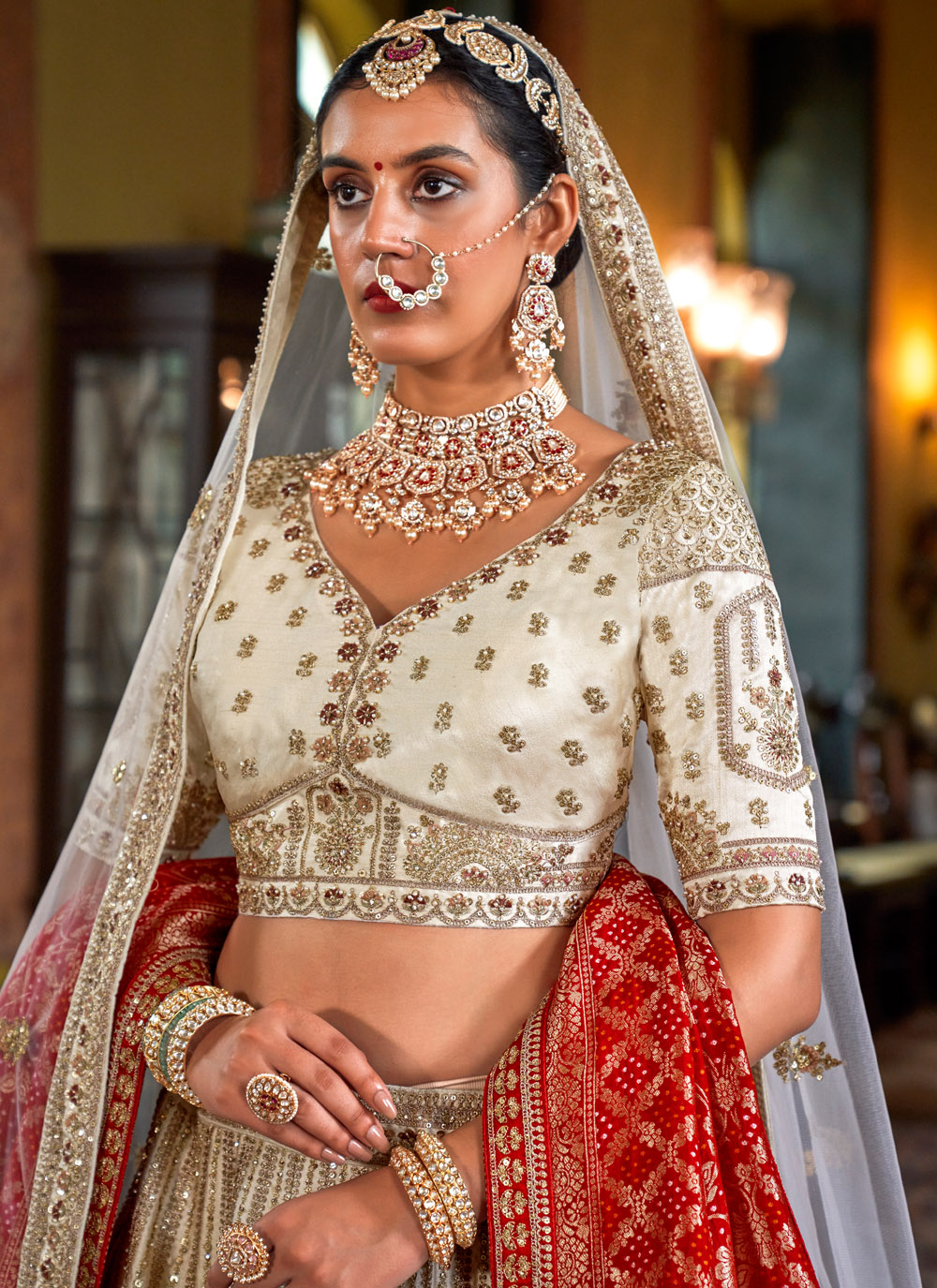 This designer white embroidered lehenga choli blends timeless artistry with a contemporary cut. The pearls and sequins add subtle sparkle, while the A-line silhouette ensures a flattering drape—ideal for brides or bridesmaids looking for graceful elegance. Comes with matching choli and dupatta.