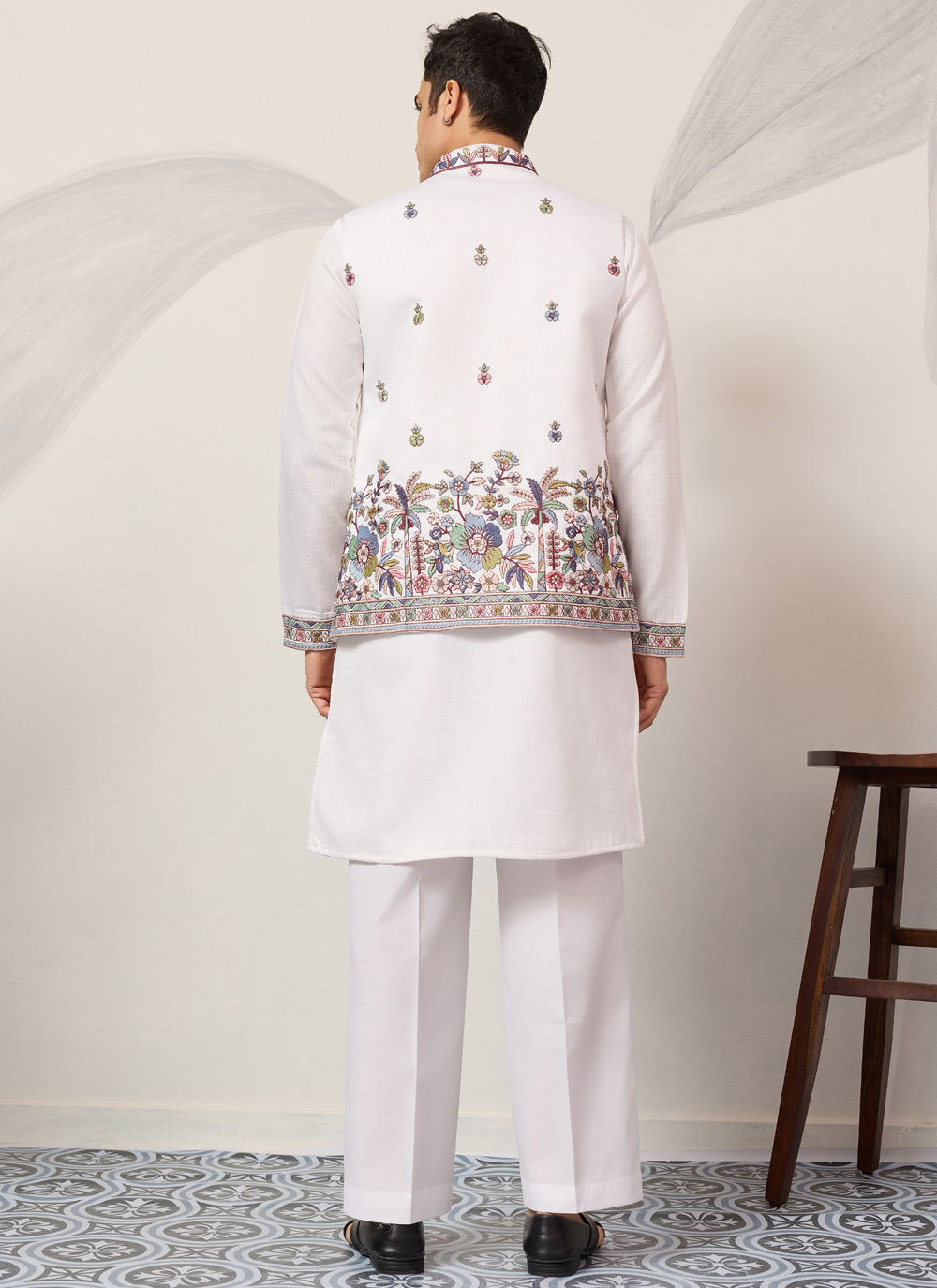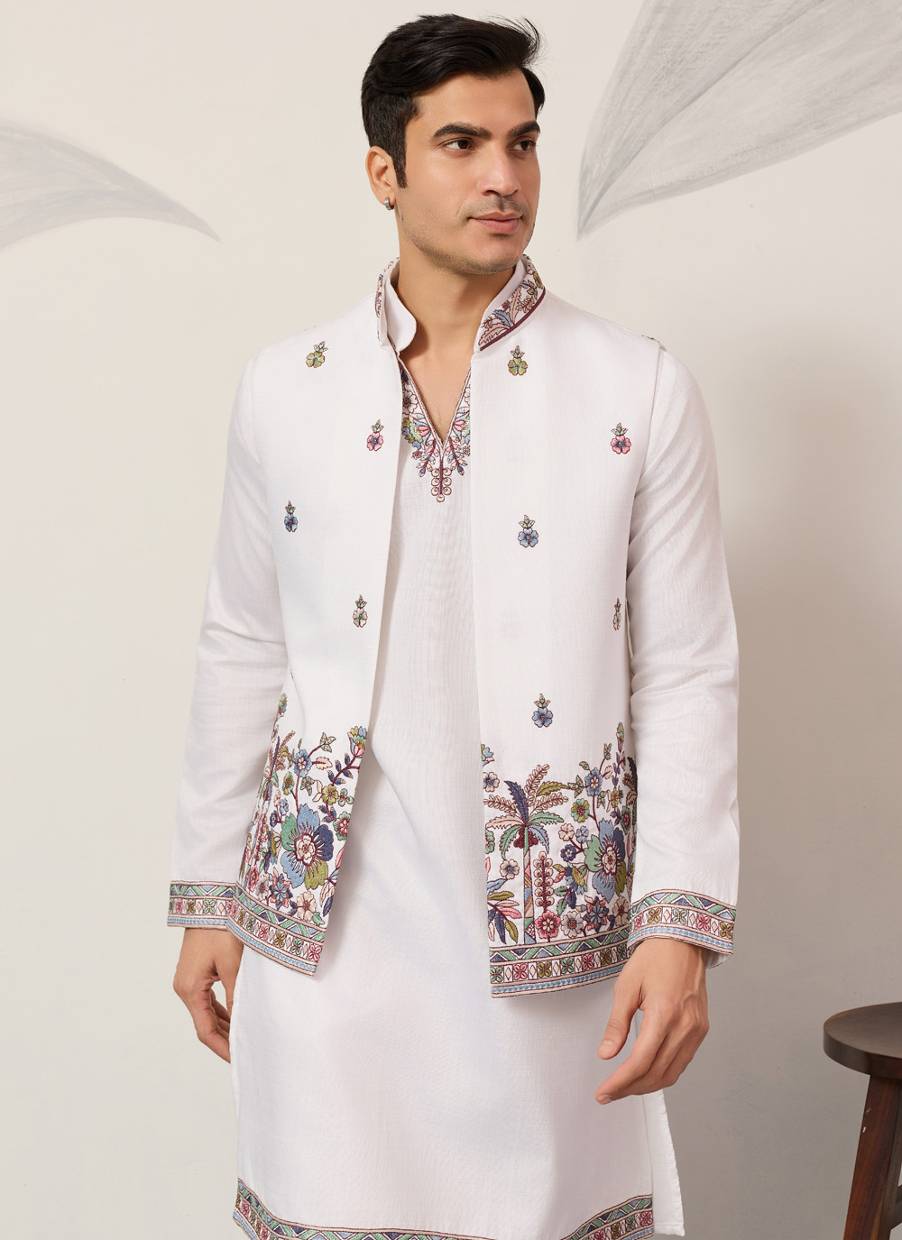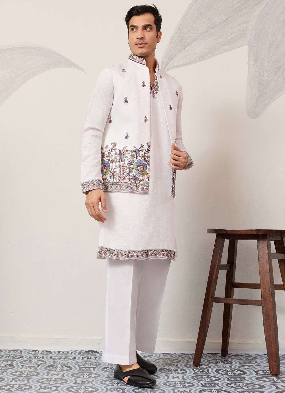 This white kurta payjama set is crafted from smooth viscose fabric and paired with a matching jacket. Sequins and thread embroidery add refined elegance, making it a perfect choice for ceremonial and wedding occasions.