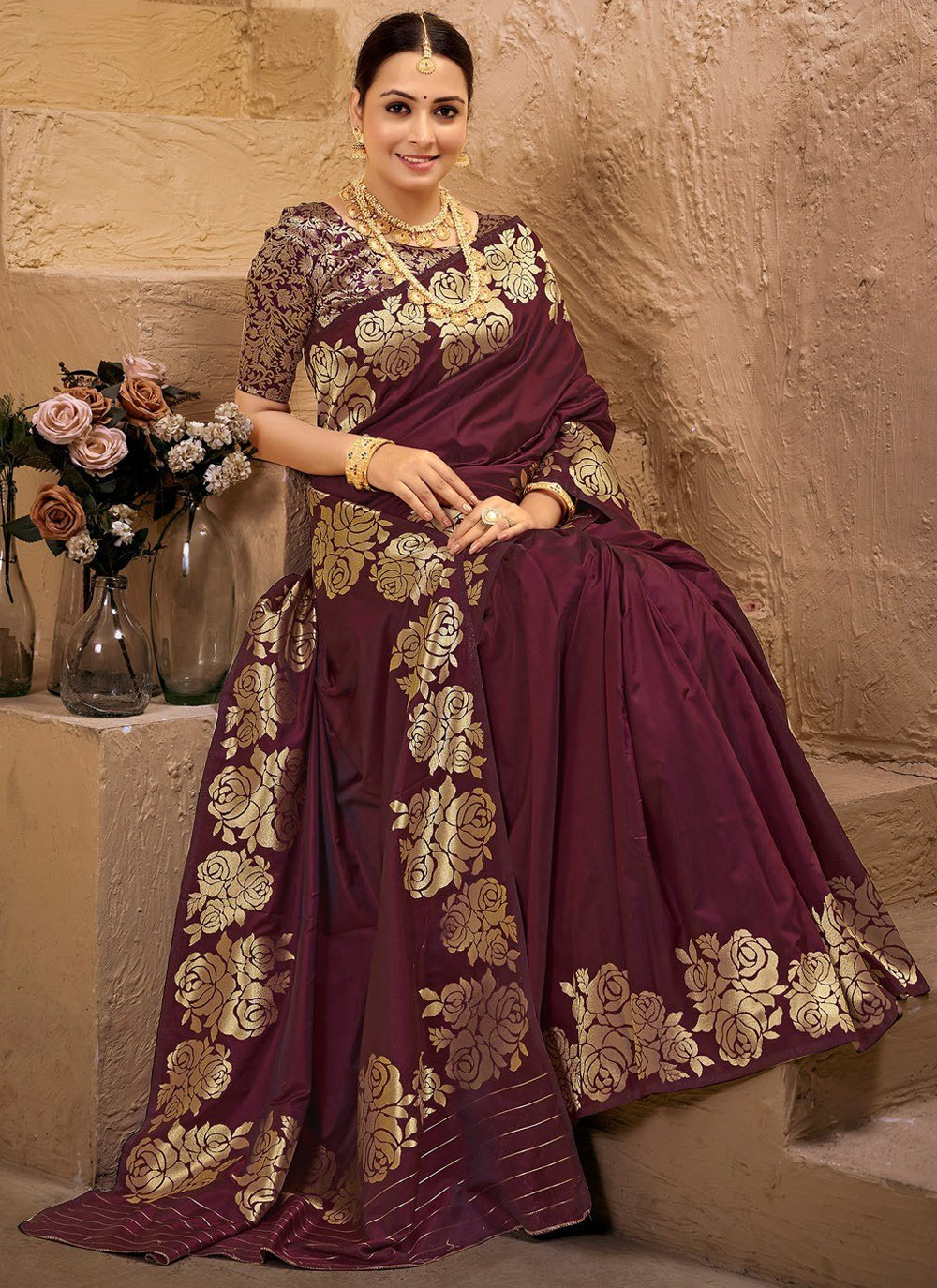 Celebrate festive moments in elegance with this wine Banarasi silk saree, beautifully crafted with intricate zari weaving. The deep wine shade adds a royal and graceful appeal, while the premium silk fabric ensures a smooth and elegant drape. Comes with matching blouse.