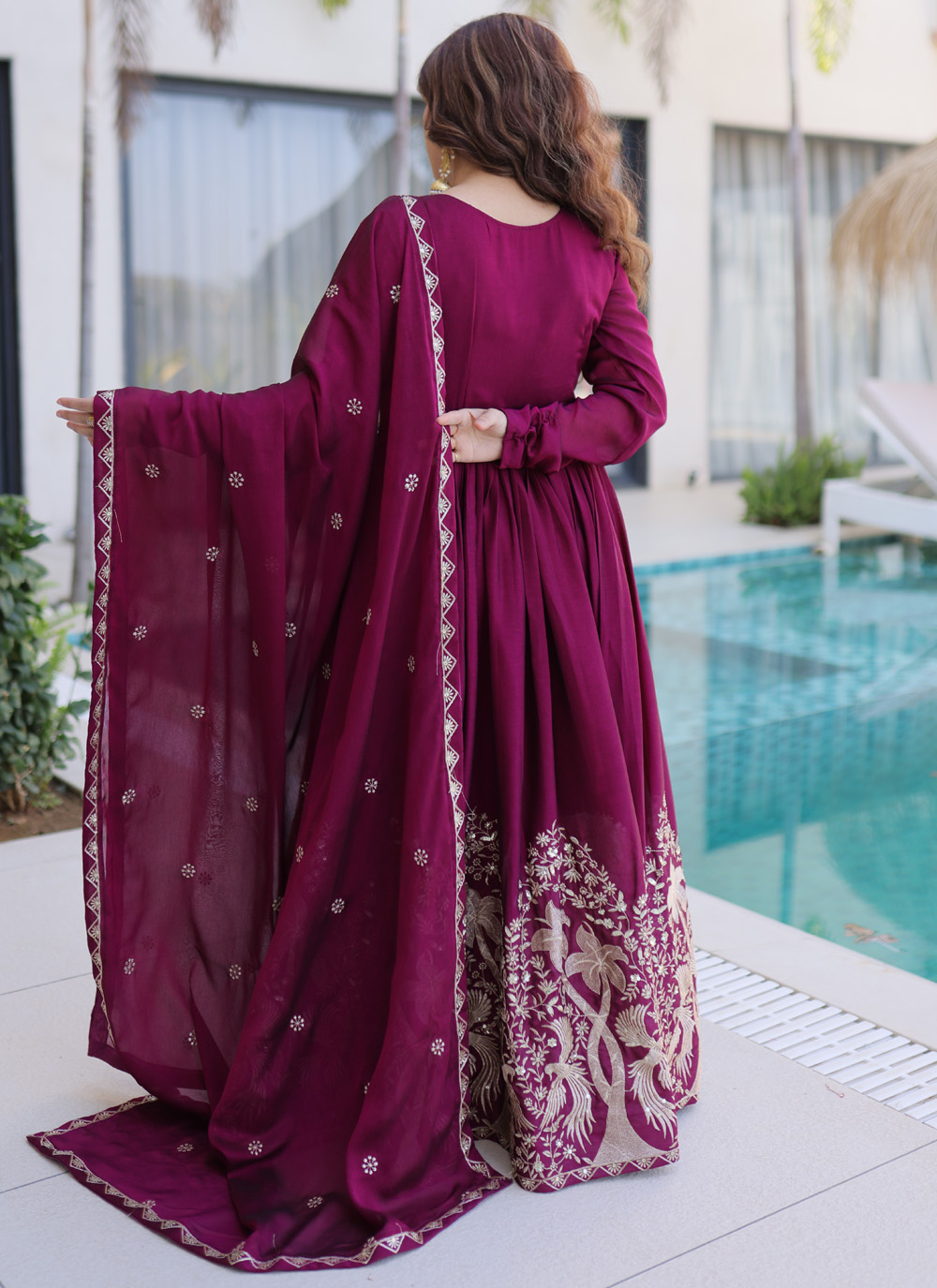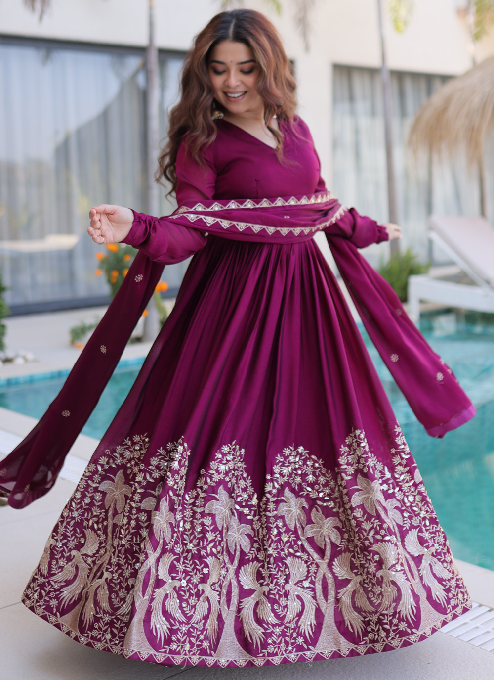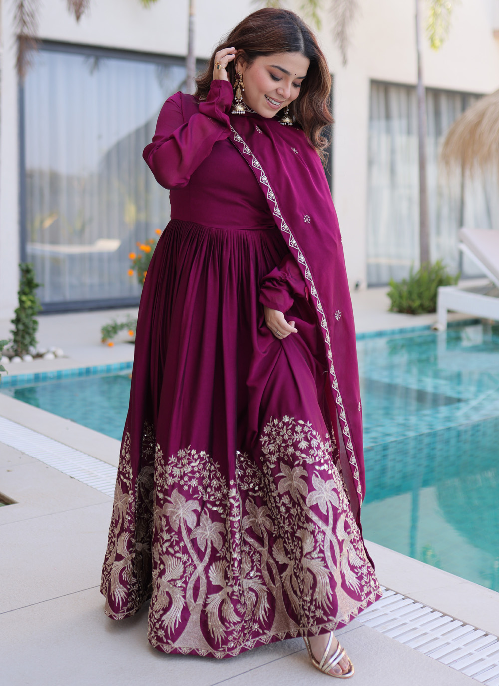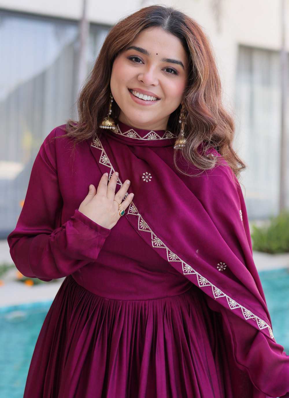 The Wine Embroidered Rangoli Crush Festival Trendy Gown beautifully blends traditional charm with modern fashion. The smooth Rangoli crush fabric offers a graceful texture while the intricate embroidery adds refined detail to the outfit. Comes with matching dupatta.