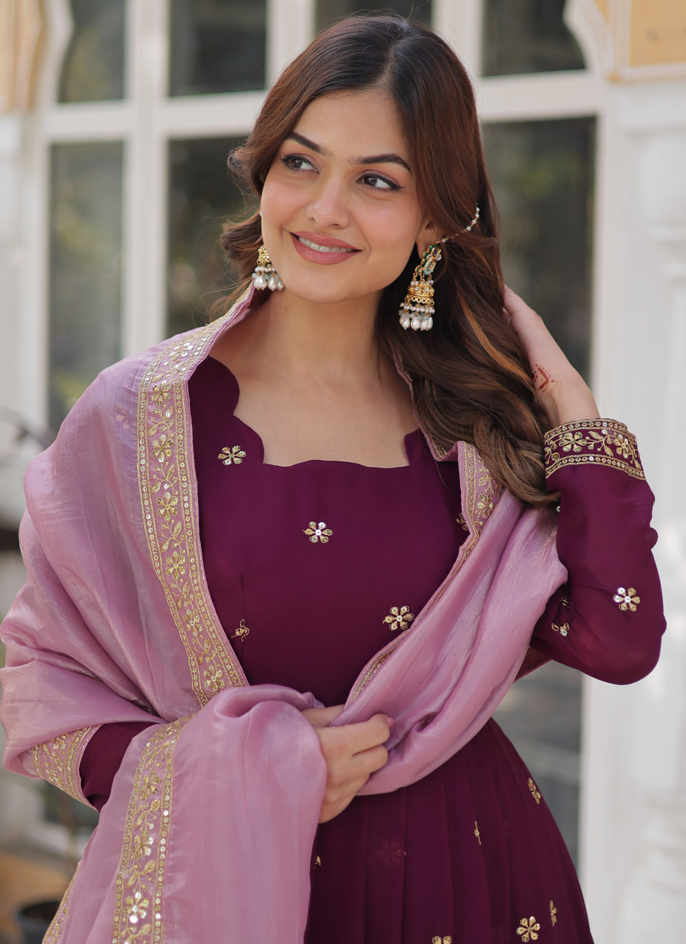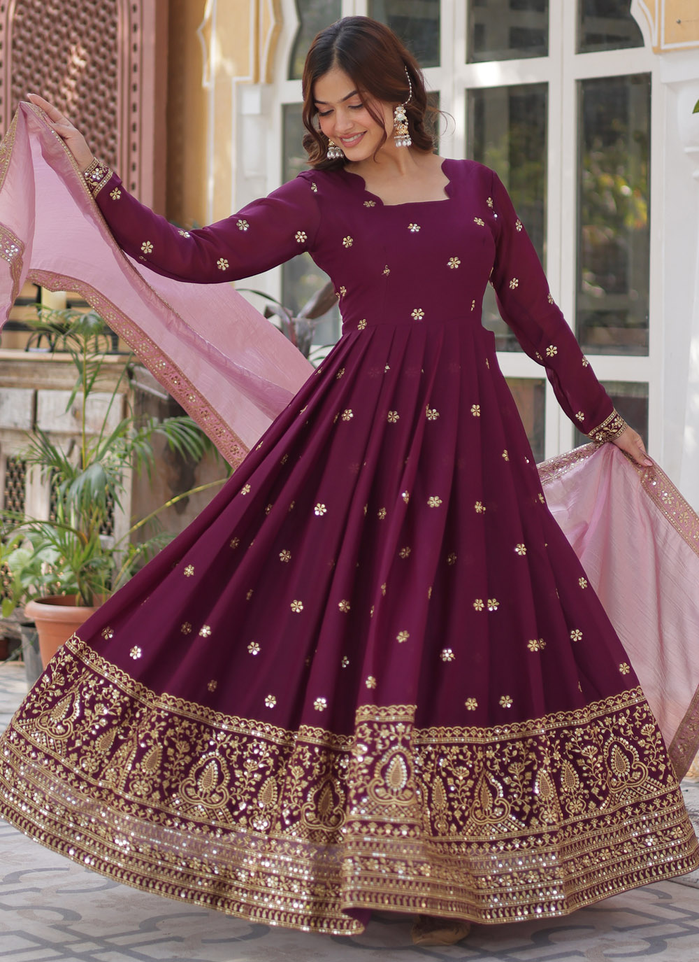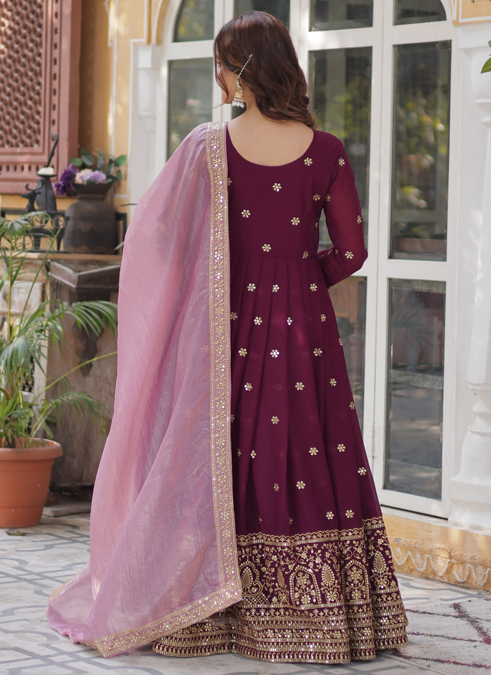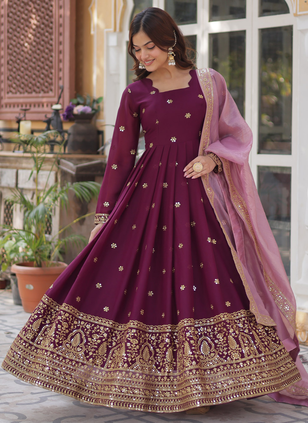 Capture everyone's attention in this fashionable wine-colored readymade gown, detailed with sequins and zari embroidery. Lightweight and glamorous, it’s a fabulous choice for festive gatherings and pre wedding celebrations. Comes with matching dupatta.