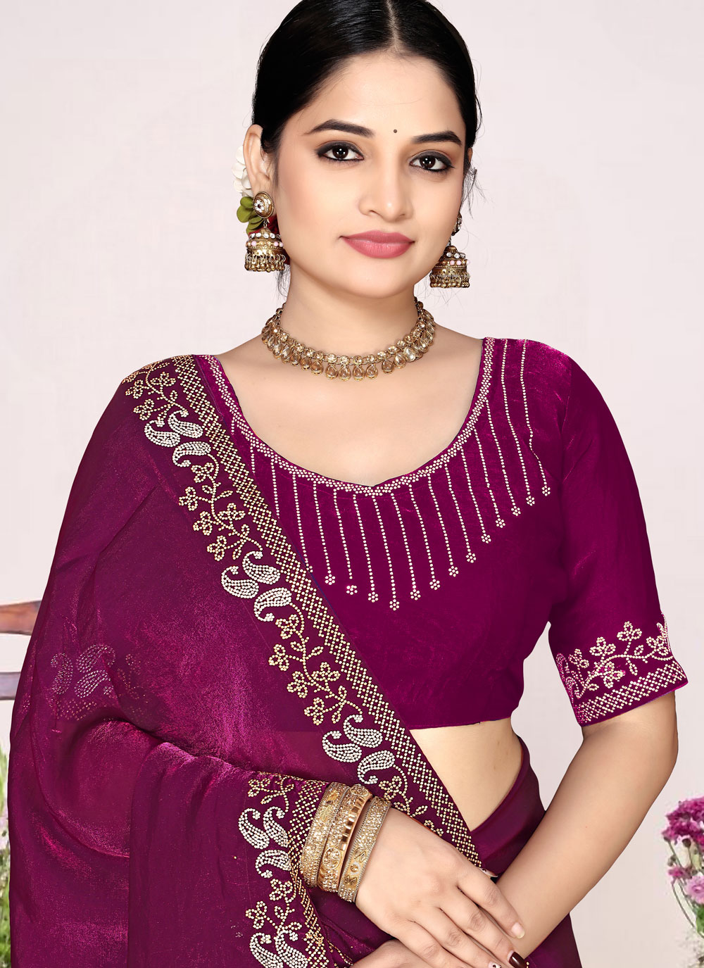 This beautifully crafted Wine Fandy Satin Silk Saree presents a stylish blend of contemporary design and traditional embellishment. The delicate zarkan accents add refined brilliance, while the silky fabric ensures comfort and elegance. Comes with matching blouse.