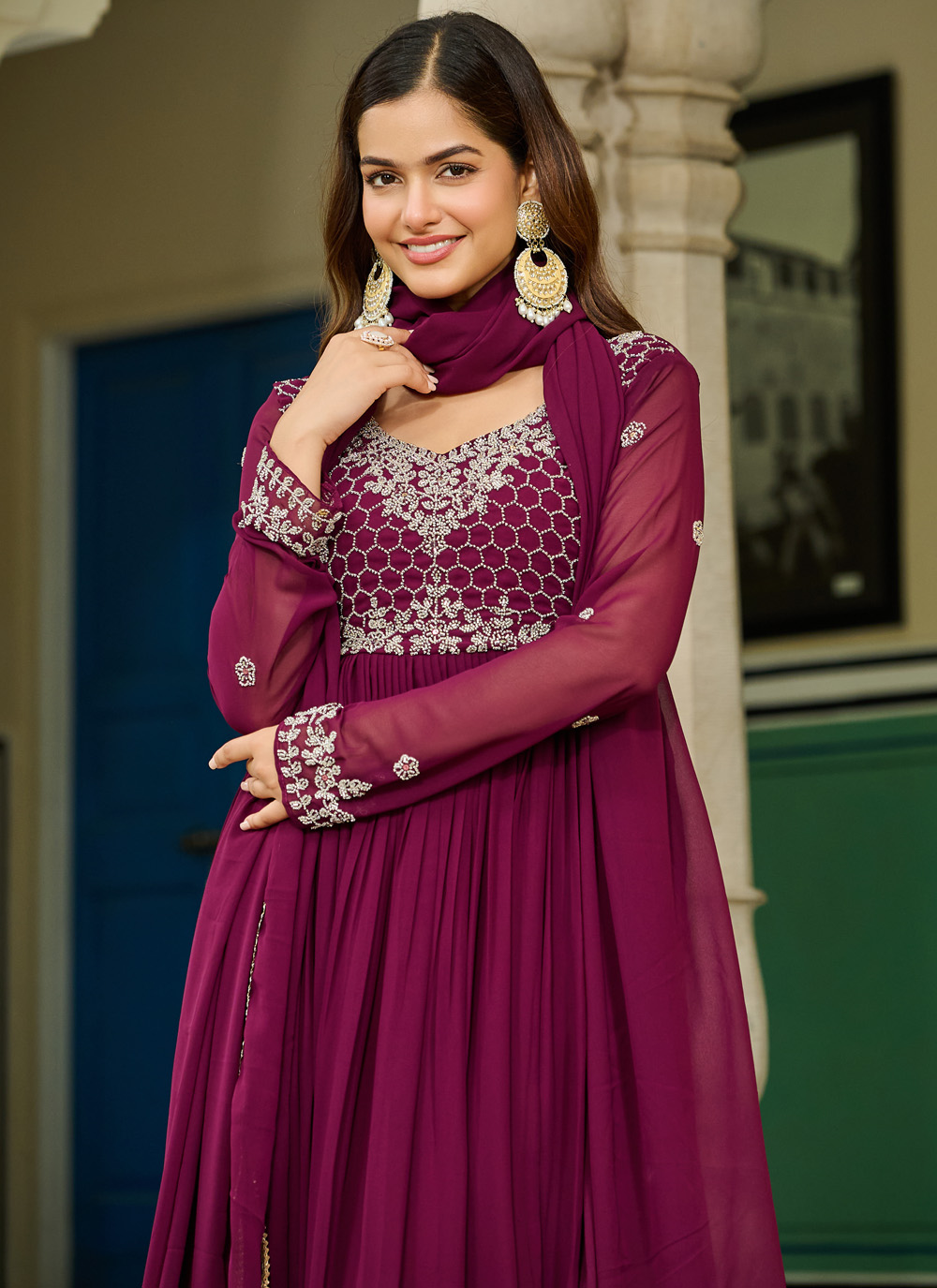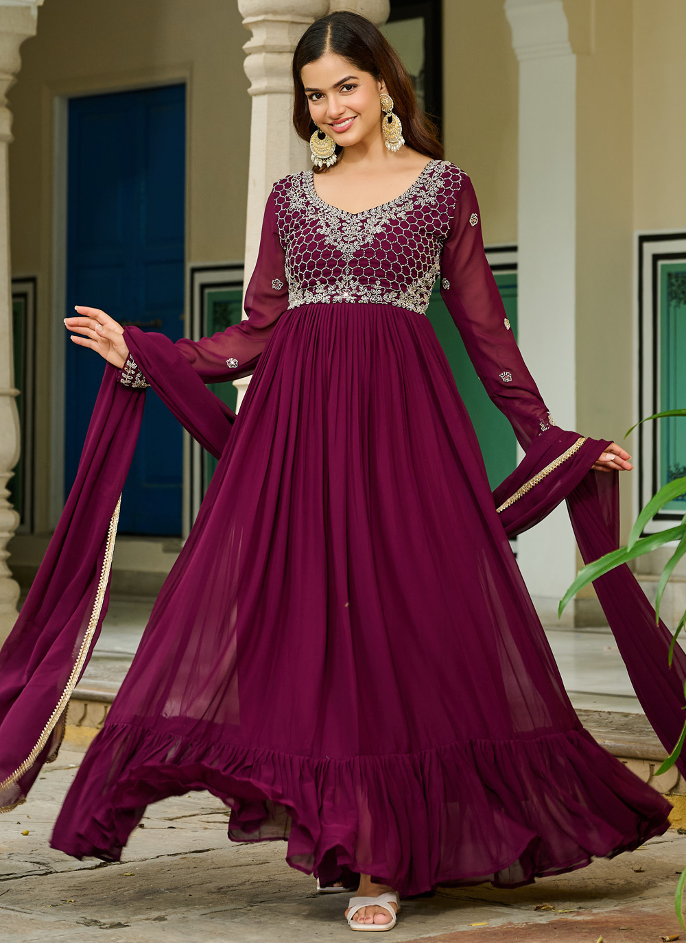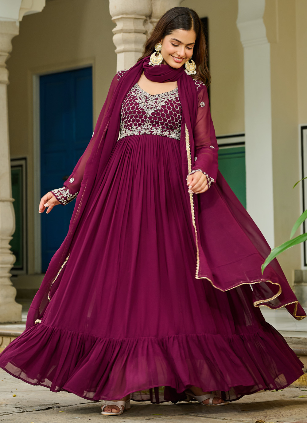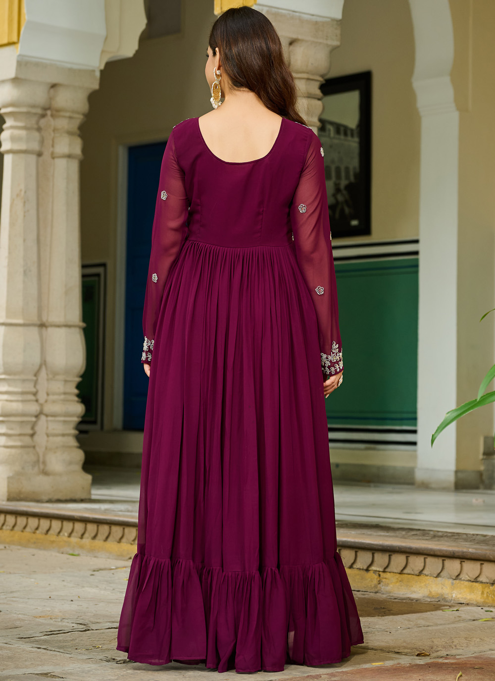 This readymade designer gown features fine beadwork that shimmers subtly, adding richness to the soft georgette fabric. The handcrafted detailing enhances the overall appeal, creating a timeless and graceful look. Comes with matching dupatta.