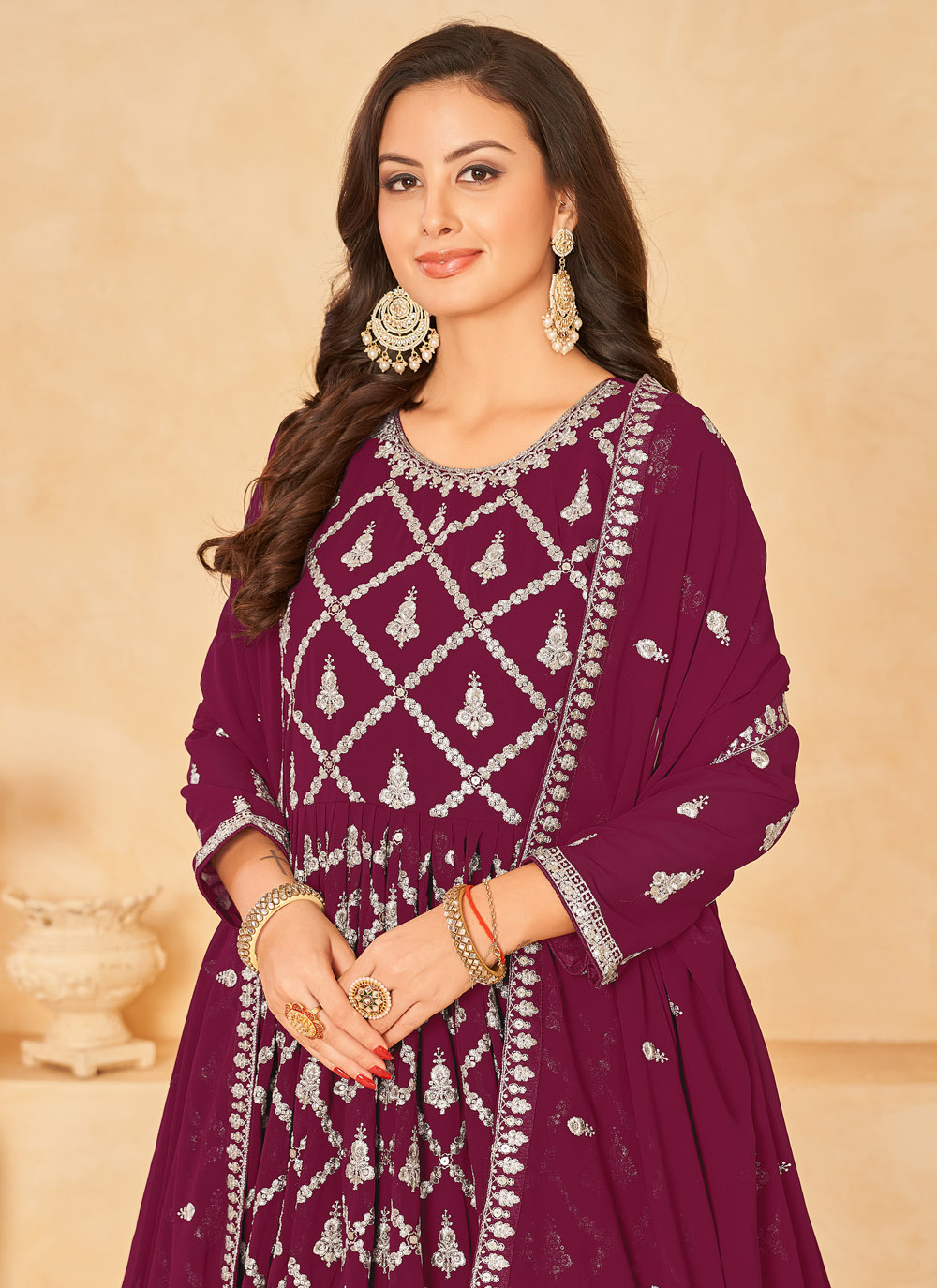 Elevate your festive wardrobe with this wine faux georgette Anarkali salwar suit, beautifully decorated with intricate resham and zari embroidery. The flowing silhouette and luxurious craftsmanship make it a striking choice for weddings, receptions and cultural festivities. Comes with matching bottom and dupatta.