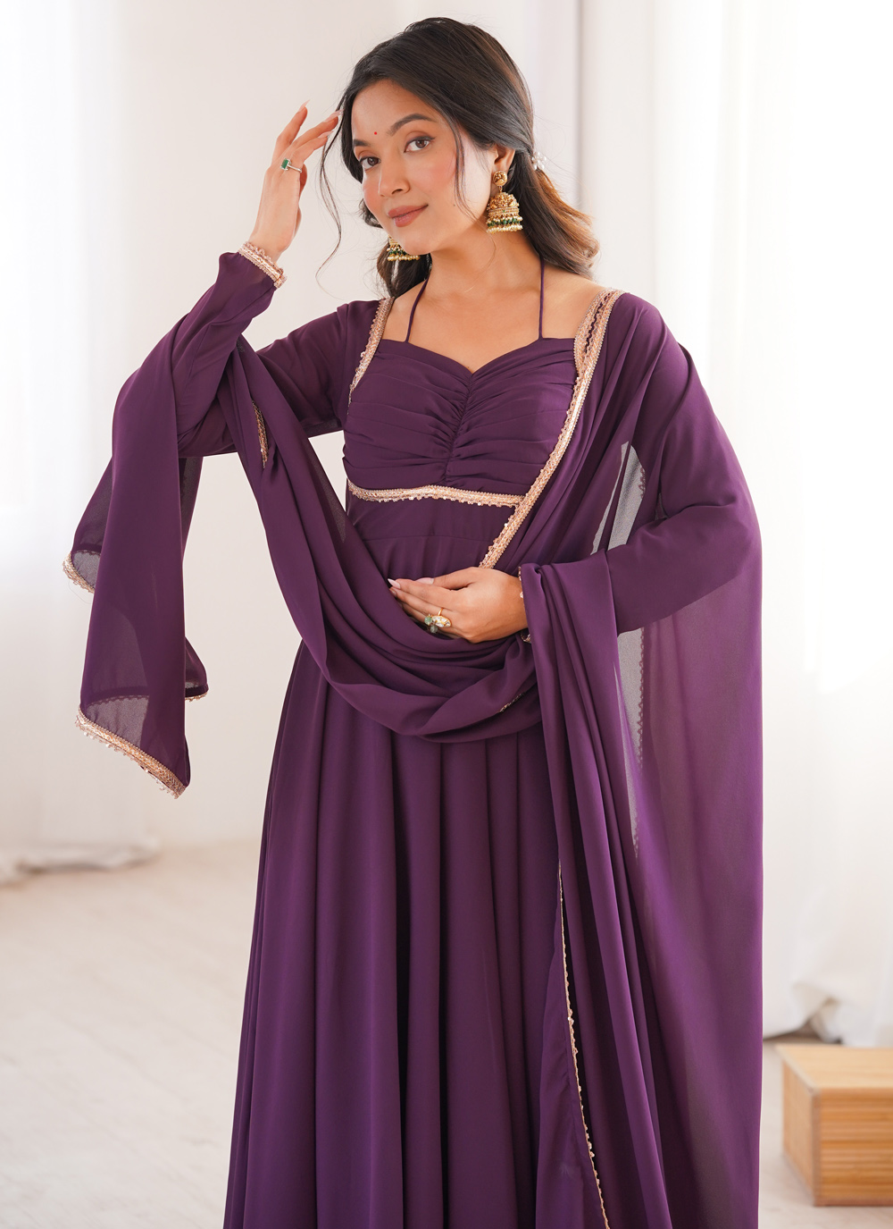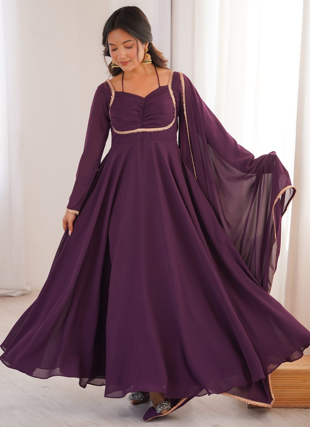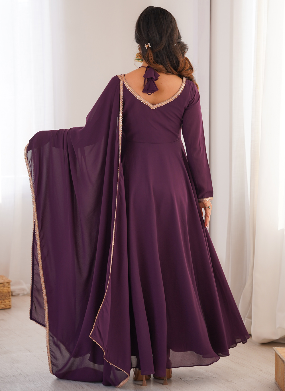 Add a touch of glamour to your wardrobe with this trendy wine faux georgette gown. The detailed lace work adds texture and richness, making it a standout choice for party wear and special occasions. Comes with matching dupatta.
