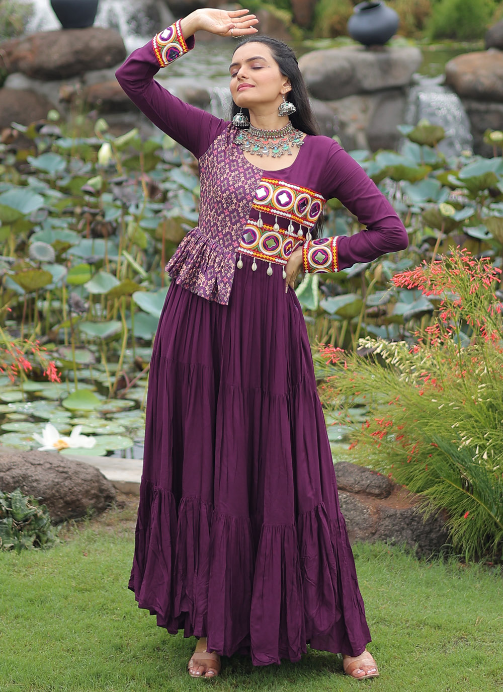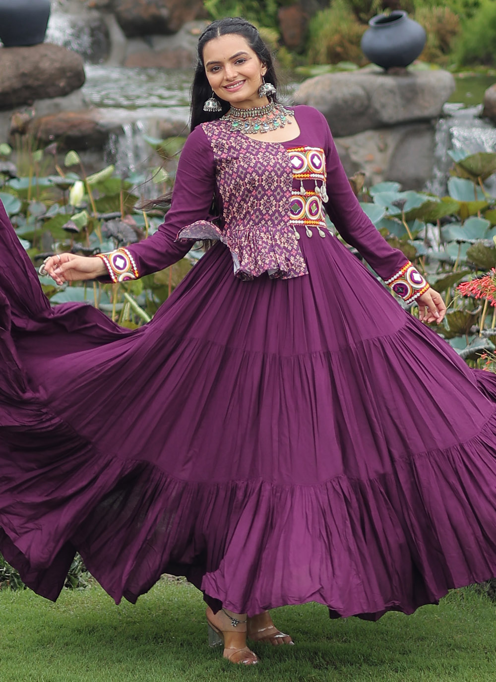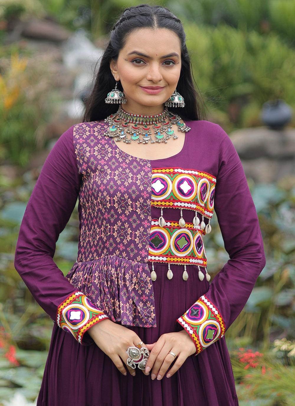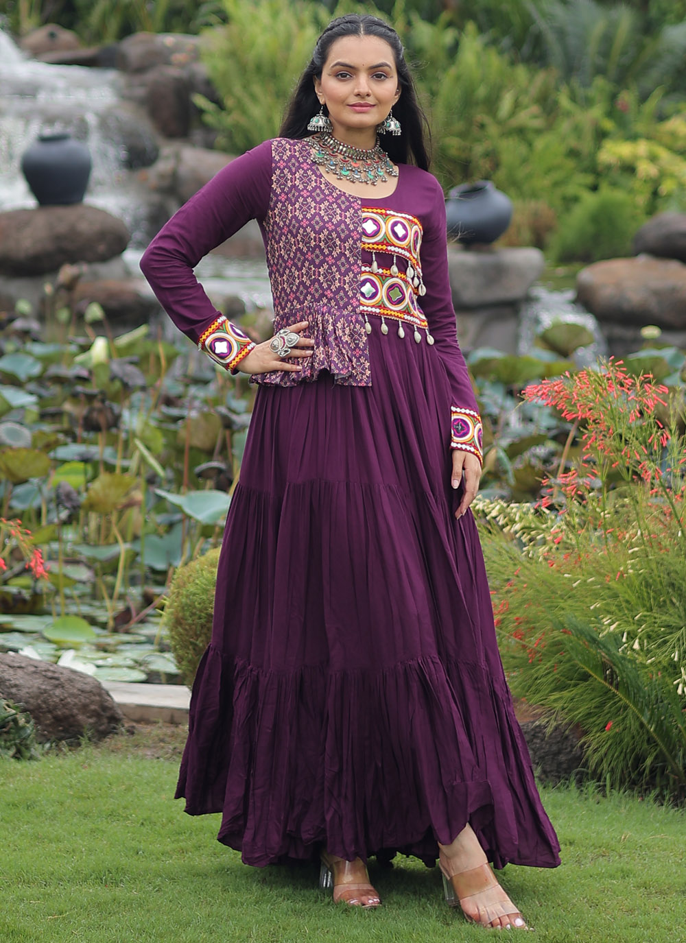 This Wine Readymade Rayon Gown featuring beautiful Gamthi embroidery and artistic ethnic prints. Designed for comfort and cultural flair, this gown is perfect for festive get-togethers, traditional functions or everyday ethnic chic.