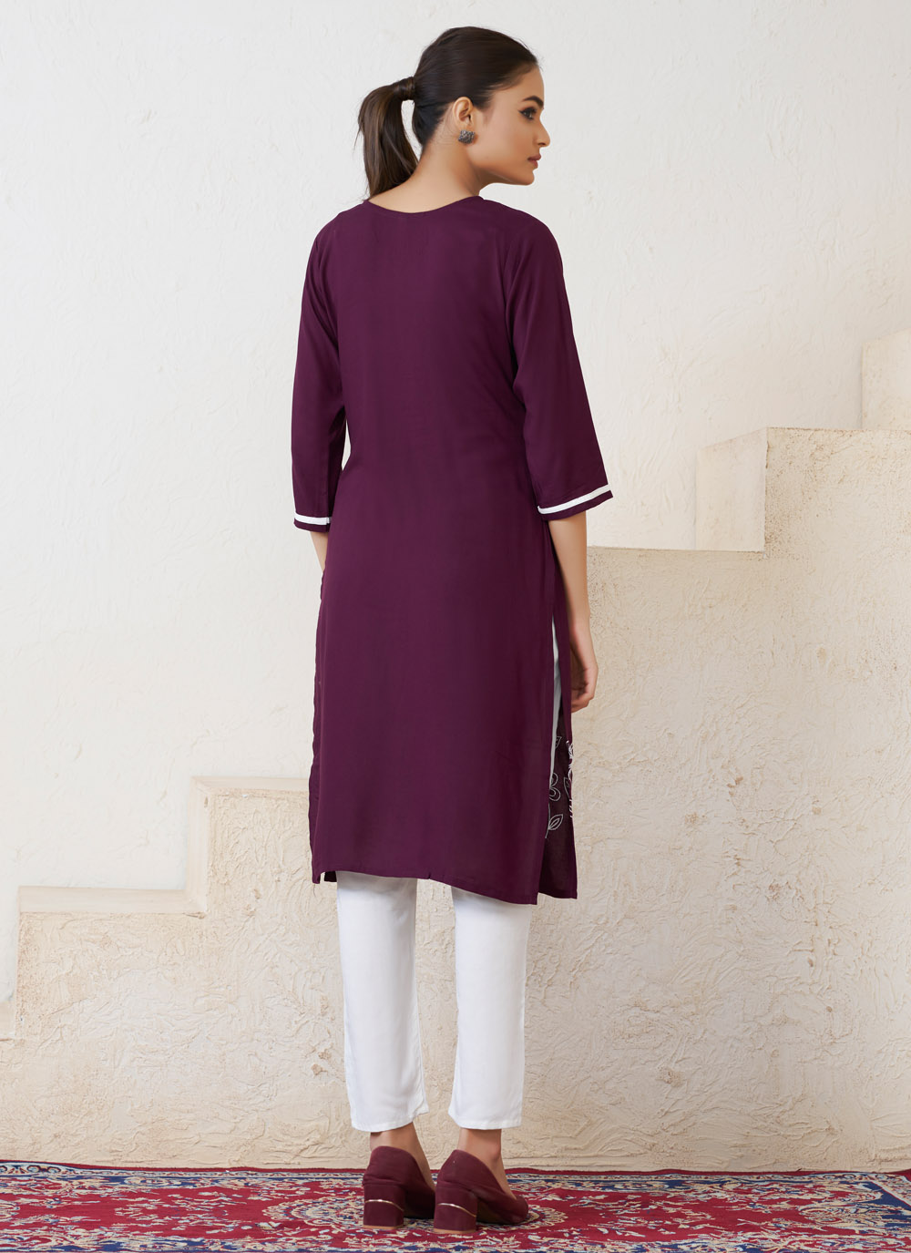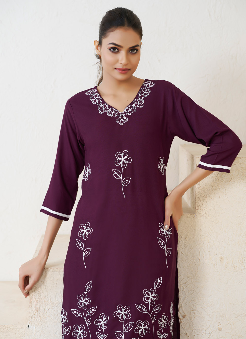 Celebrate in style with this trendy Wine Embroidered Kurti made from soft rayon fabric. Its subtle yet eye-catching embroidery adds just the right amount of sparkle to your festive look.
