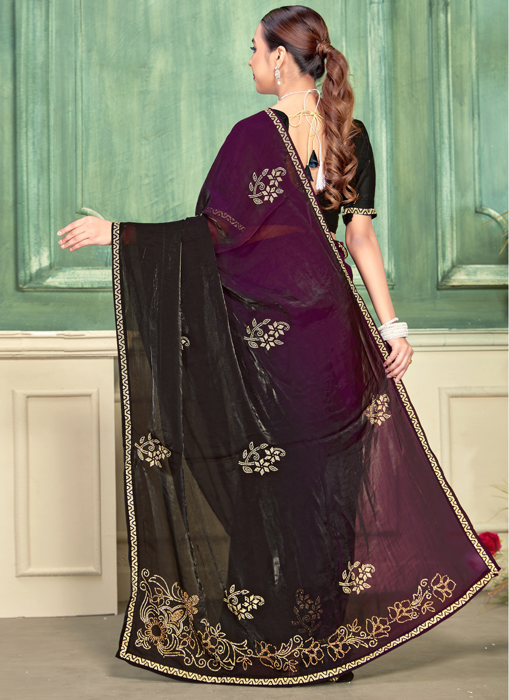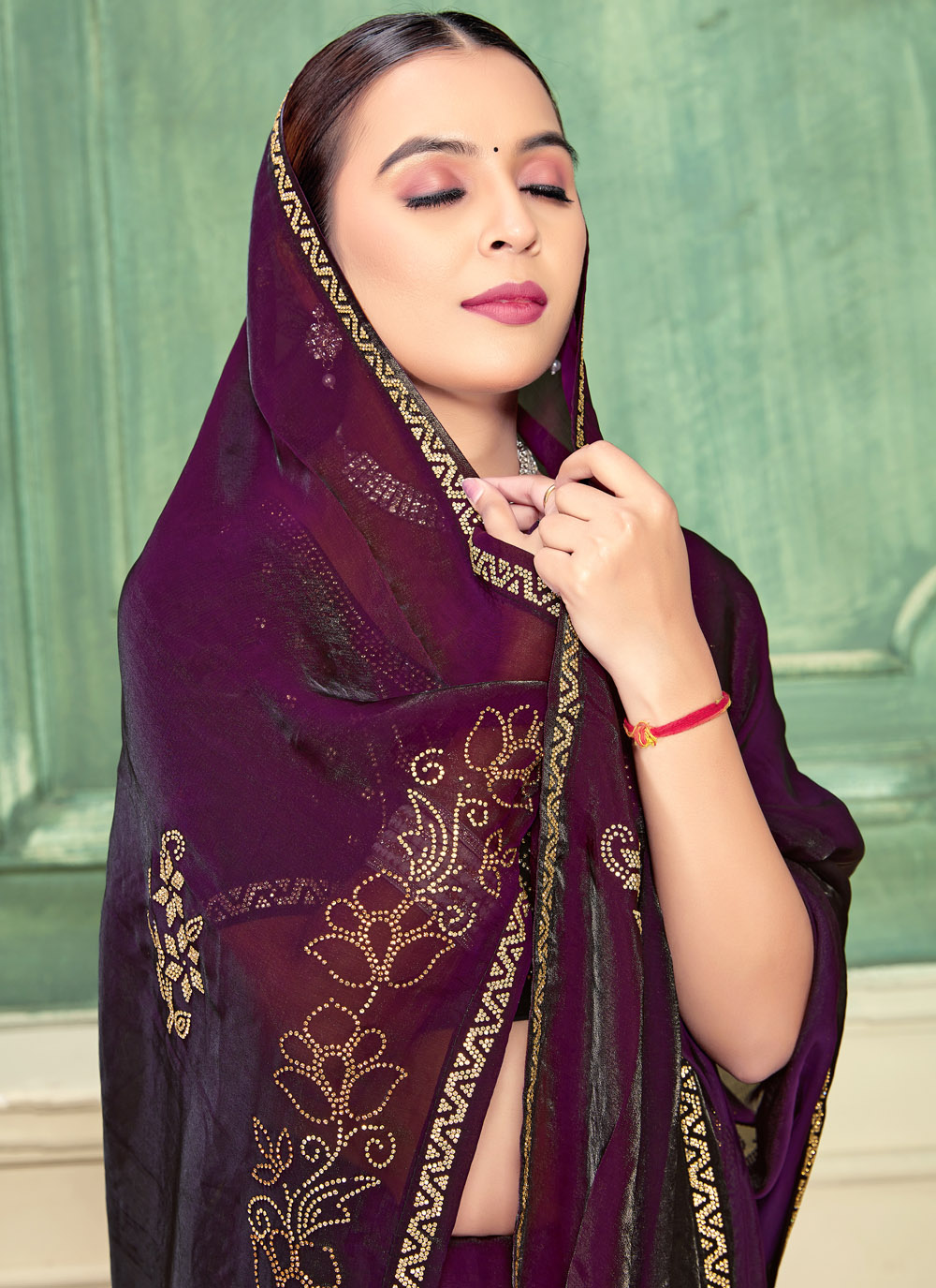 Make every celebration memorable with this satin silk saree in stunning wine color, featuring elegant zarkan hand embroidery and ornate border design. Its rich tone and smooth drape make it a statement piece for receptions and grand celebrations. Comes with matching blouse.