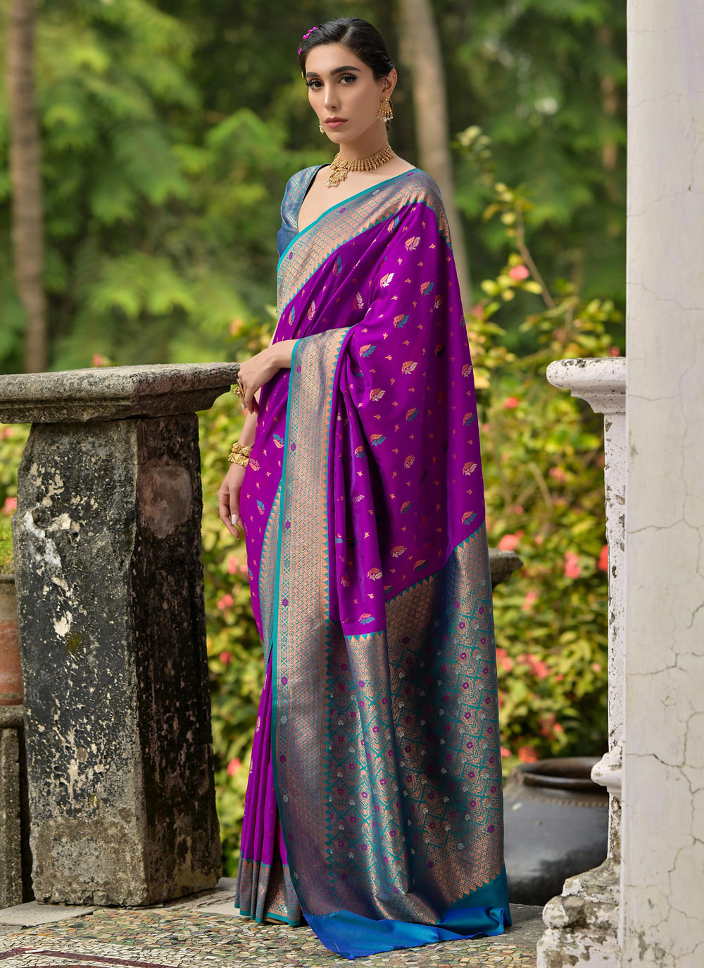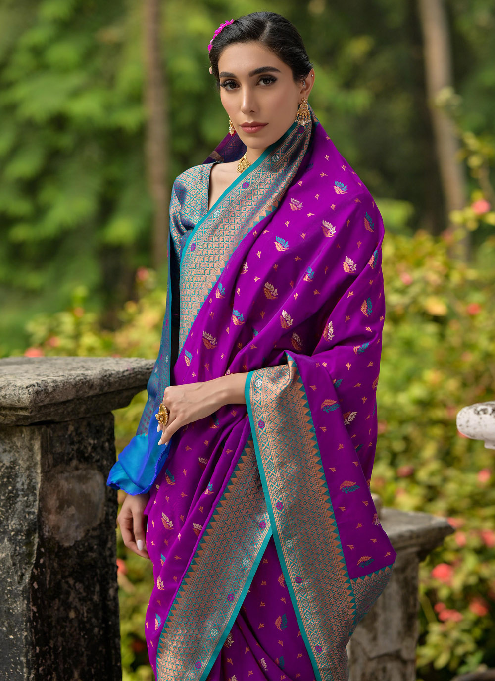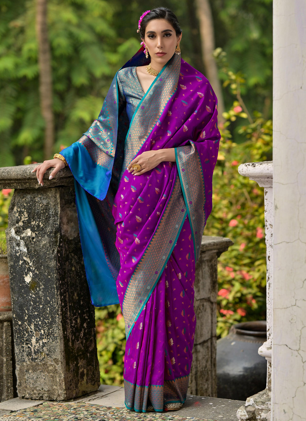Embrace the beauty of traditional artistry with the Woven Banarasi Silk Purple Classic Designer Saree. The deep purple hue, combined with intricate woven patterns, showcases the best of Banarasi silk craftsmanship. Perfect for weddings, receptions, and cultural events. Comes with matching blouse.