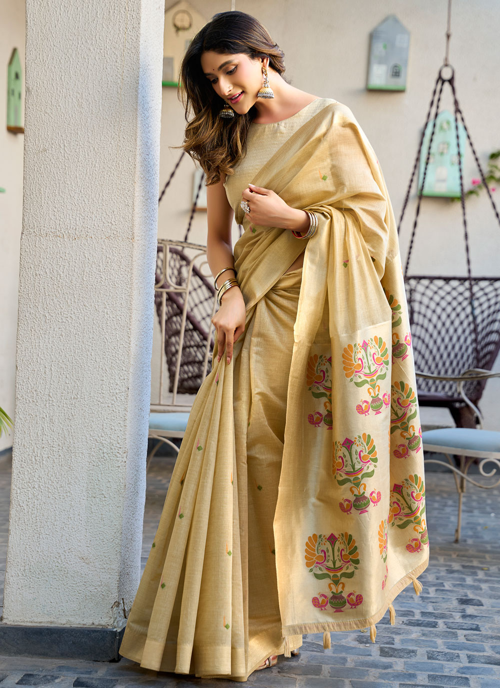The Woven Cotton Jacquard Traditional Saree in Cream reflects timeless elegance with its soft neutral tone and classic weaving. Crafted from breathable cotton fabric, it offers a lightweight and comfortable drape for all-day wear. Comes with matching blouse.