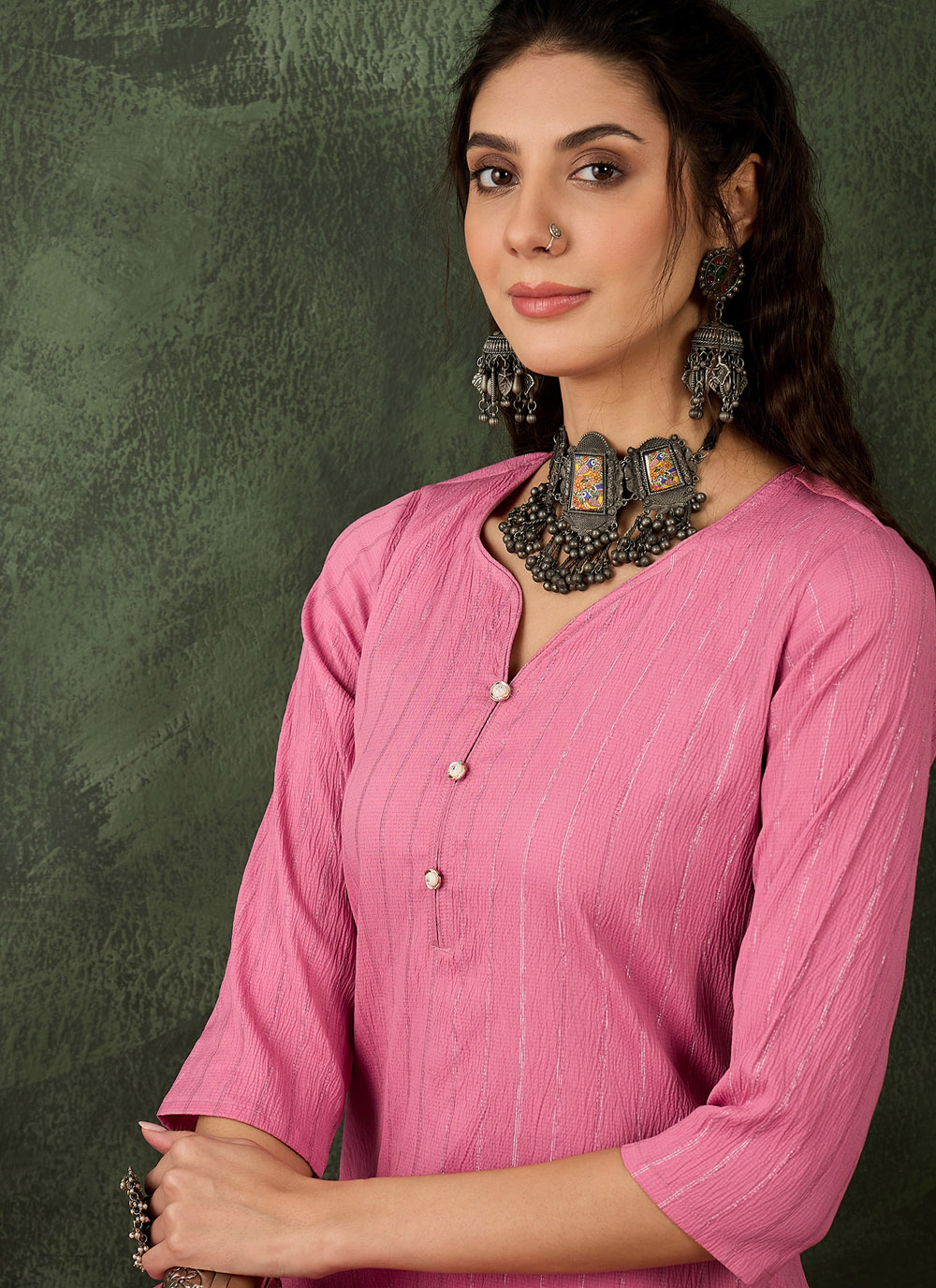 Celebrate every occasion in style with this woven pink cotton silk blend party wear kurti. The rich fabric and detailed woven design create a perfect balance of comfort and festive elegance.
