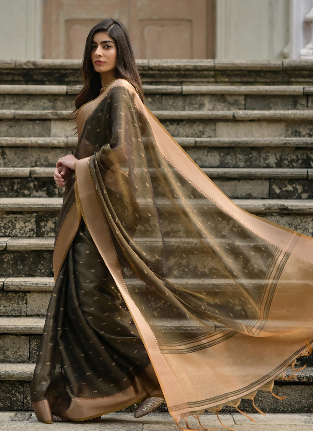 The Woven Silk Brown Classic Saree, paired with a matching blouse, offers timeless elegance and sophistication. Perfect for formal events and festive occasions, it adds a refined touch to your wardrobe.