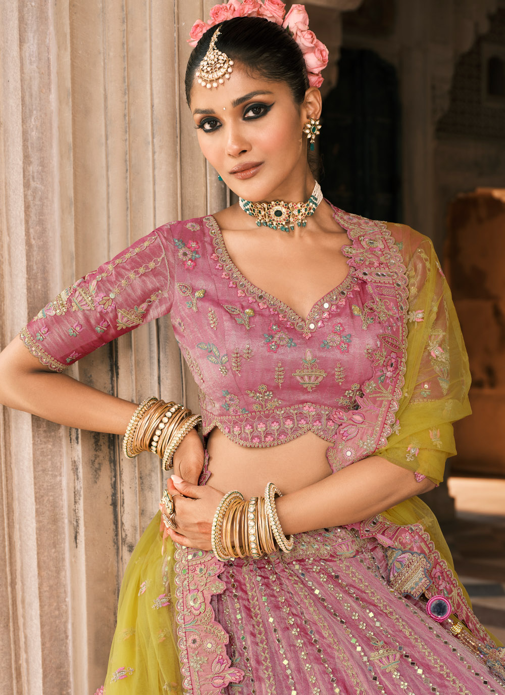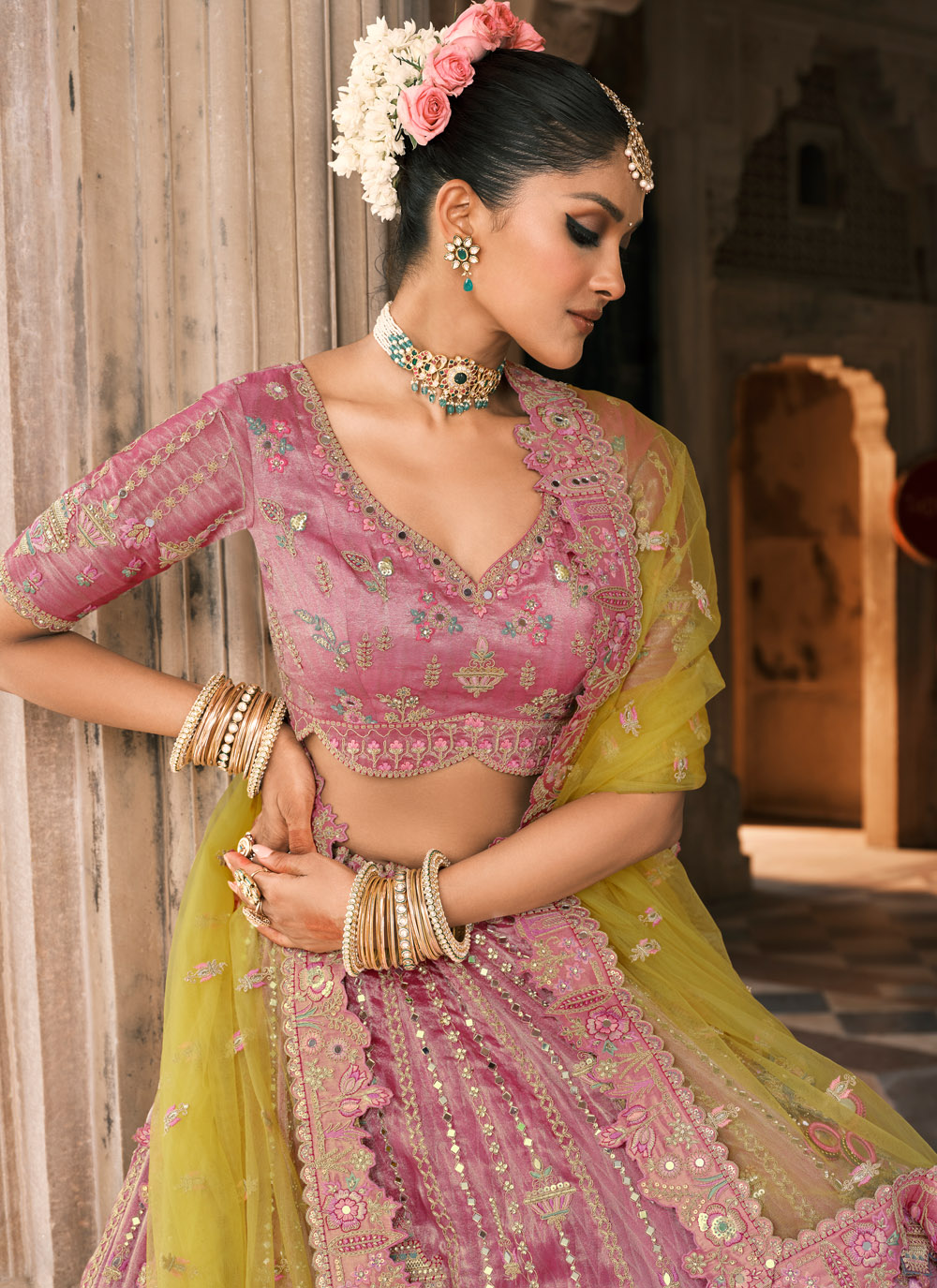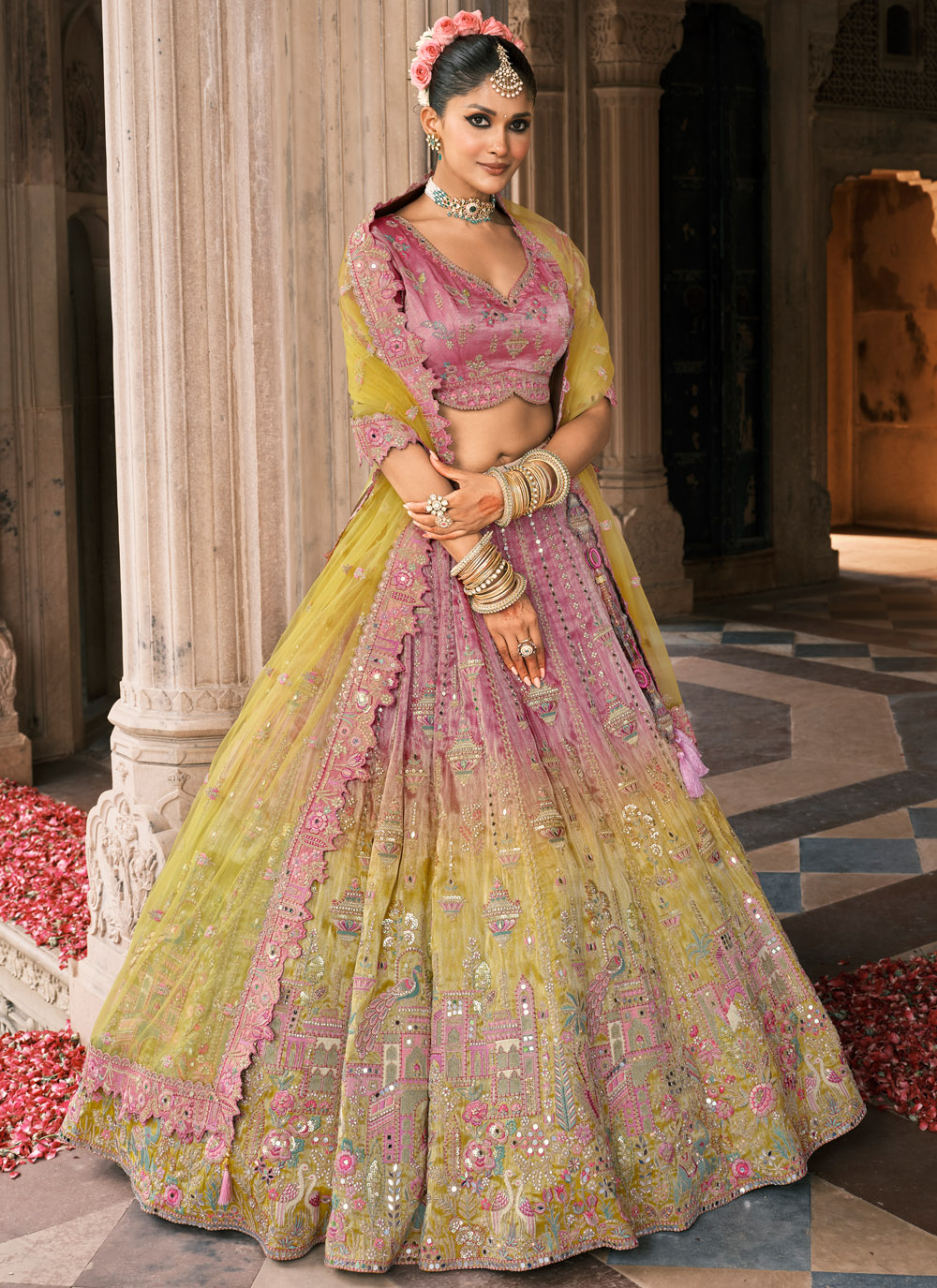 Crafted in striking hues of yellow and pink, this lehenga choli is adorned with sequins, mirror work, thread artistry, and stone embellishments. Its modern yet ethnic design makes it ideal for engagements, haldi functions or weddings. Comes with matching choli and dupatta.