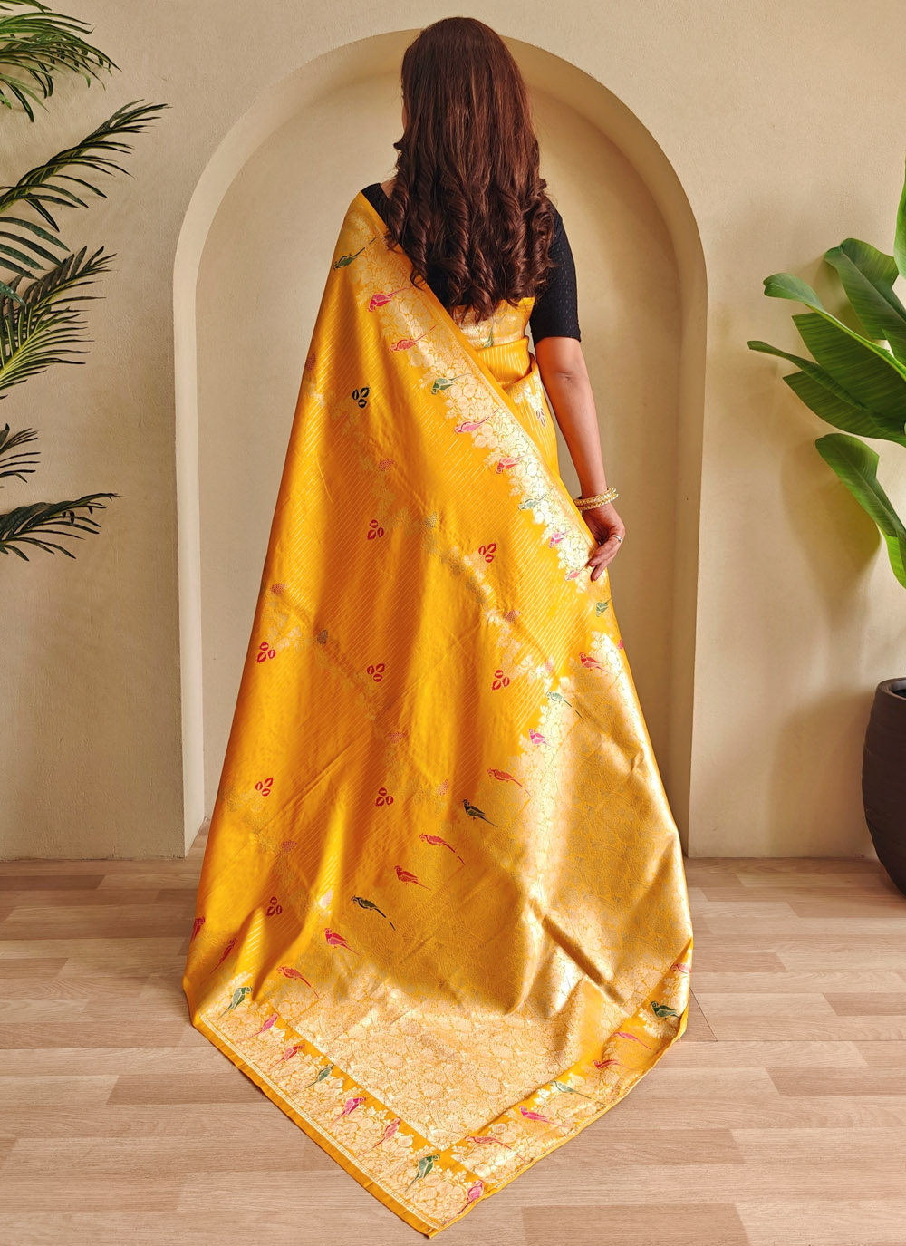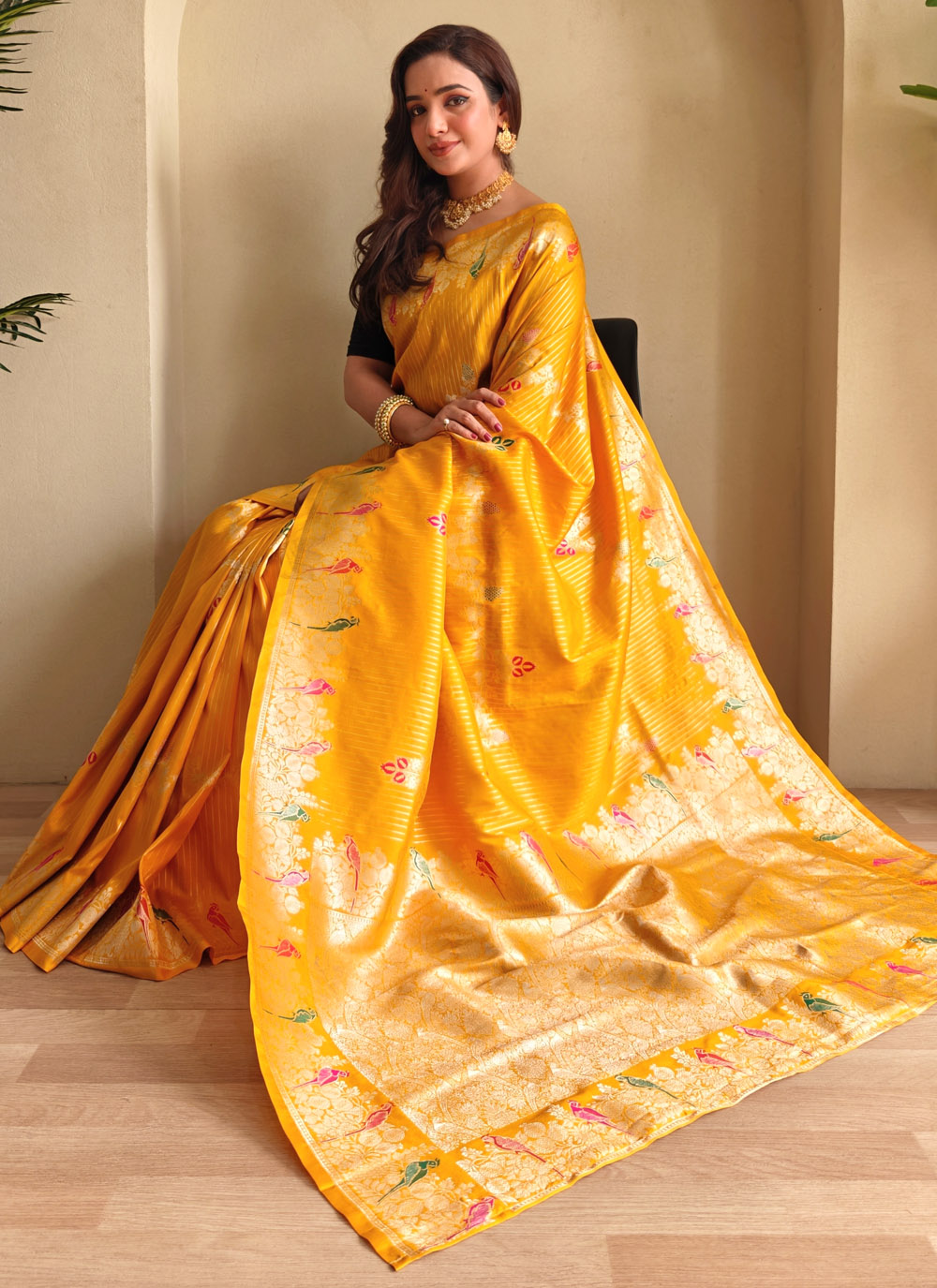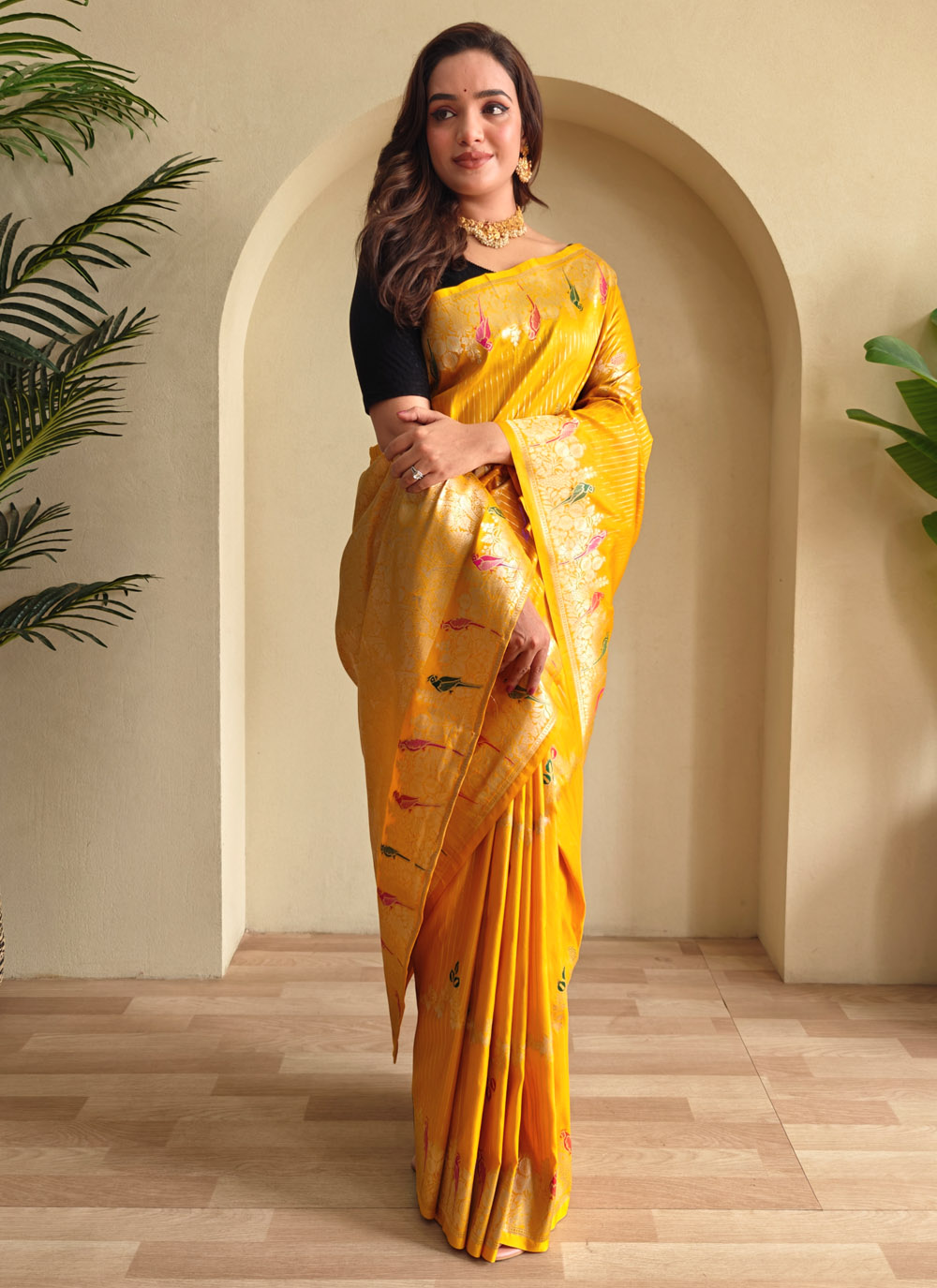 Grace meets grandeur in this designer Banarasi satin silk saree in a radiant yellow hue. Embellished with exquisite zari weaving work, this saree is a celebration of traditional artistry and modern elegance. Comes with matching blouse.