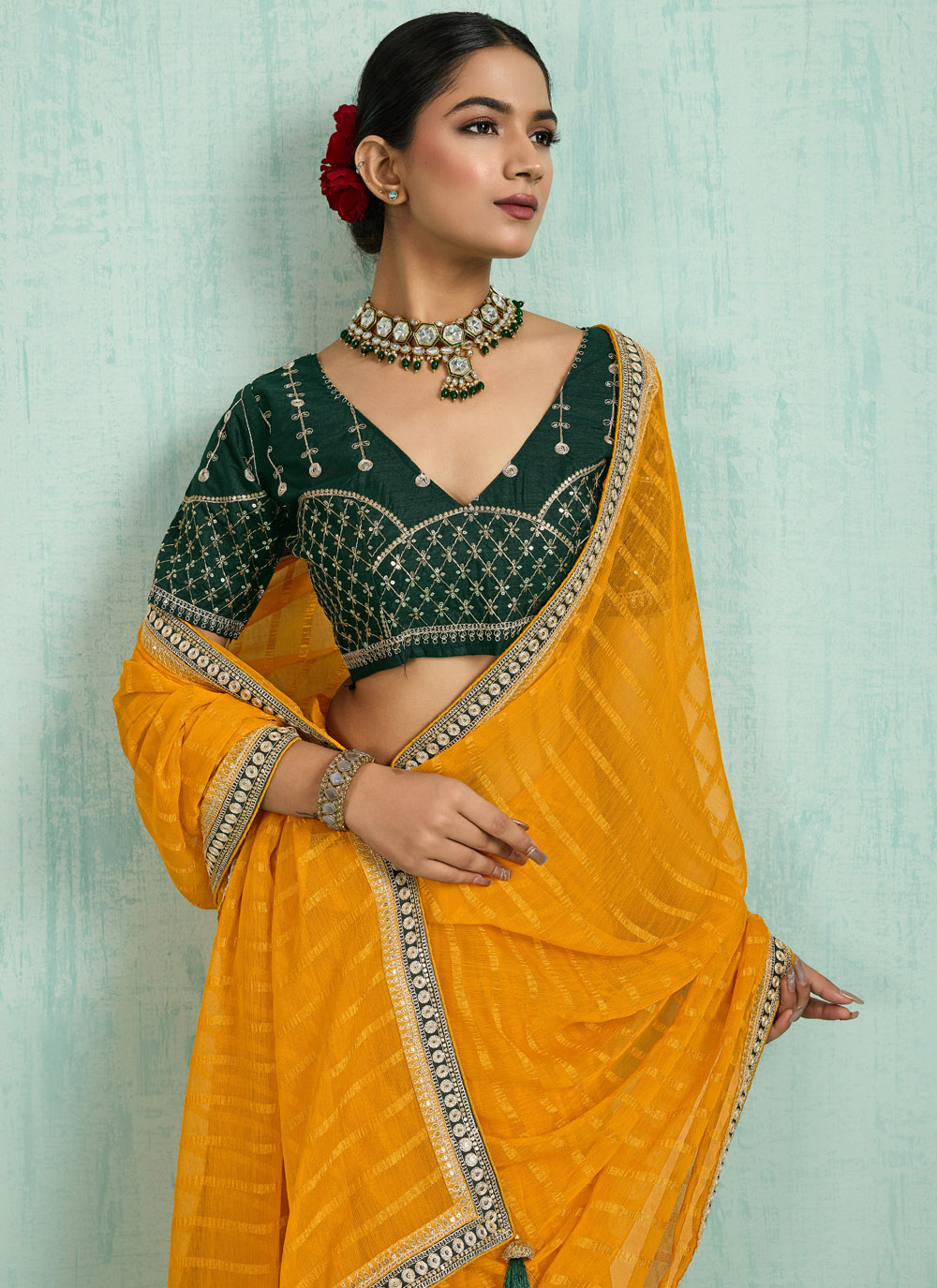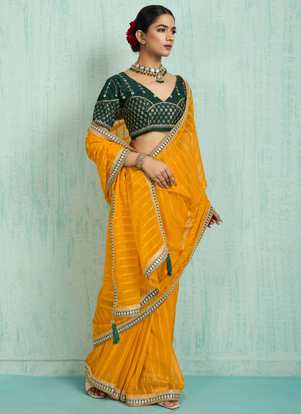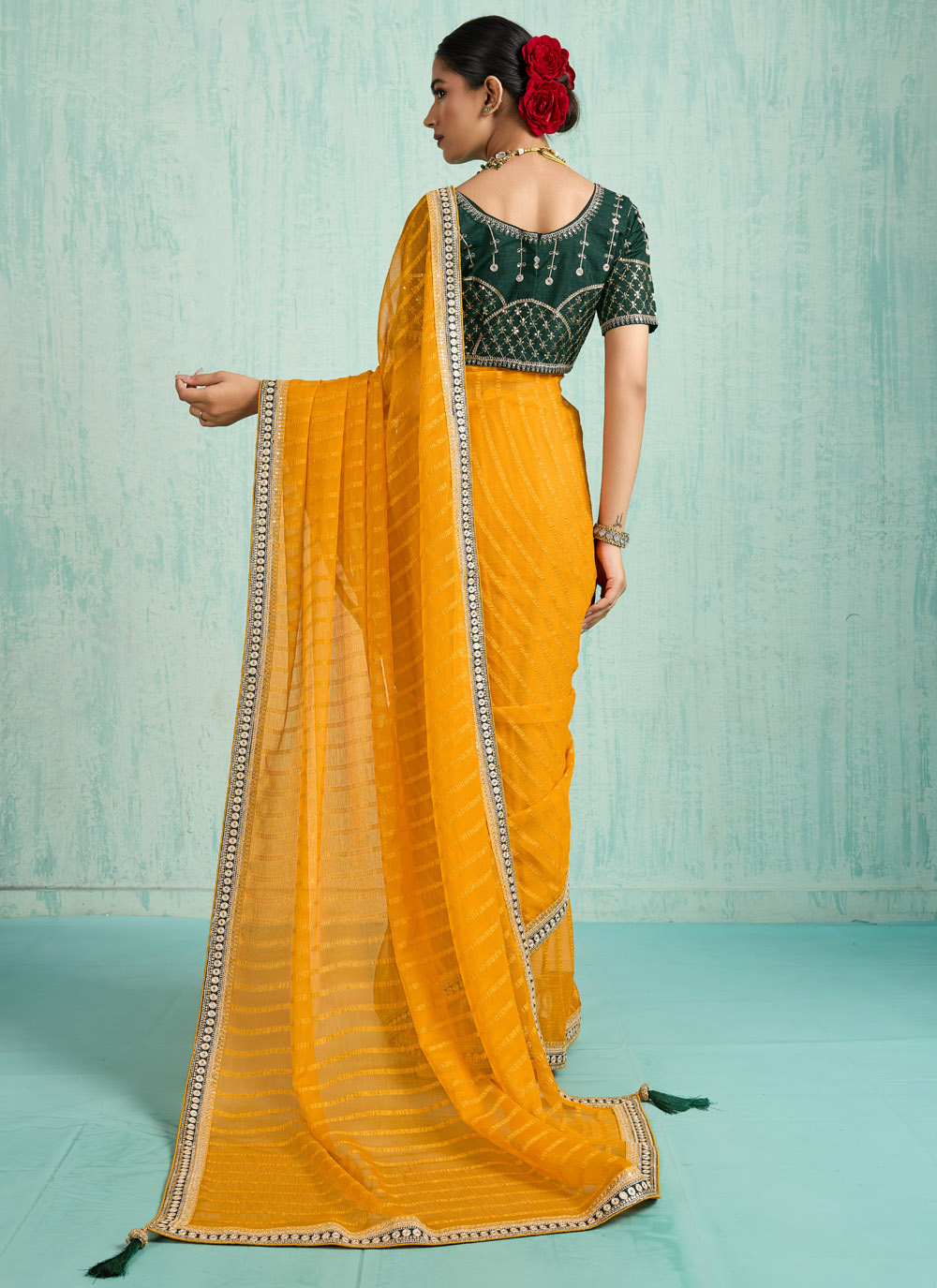 This traditional yellow chiffon saree shines with zari embroidery and sequins detailing. Lightweight and flowy, it brings comfort along with elegance, perfectly suited for festive occasions and traditional events. Comes with matching blouse.