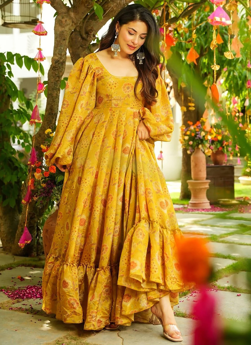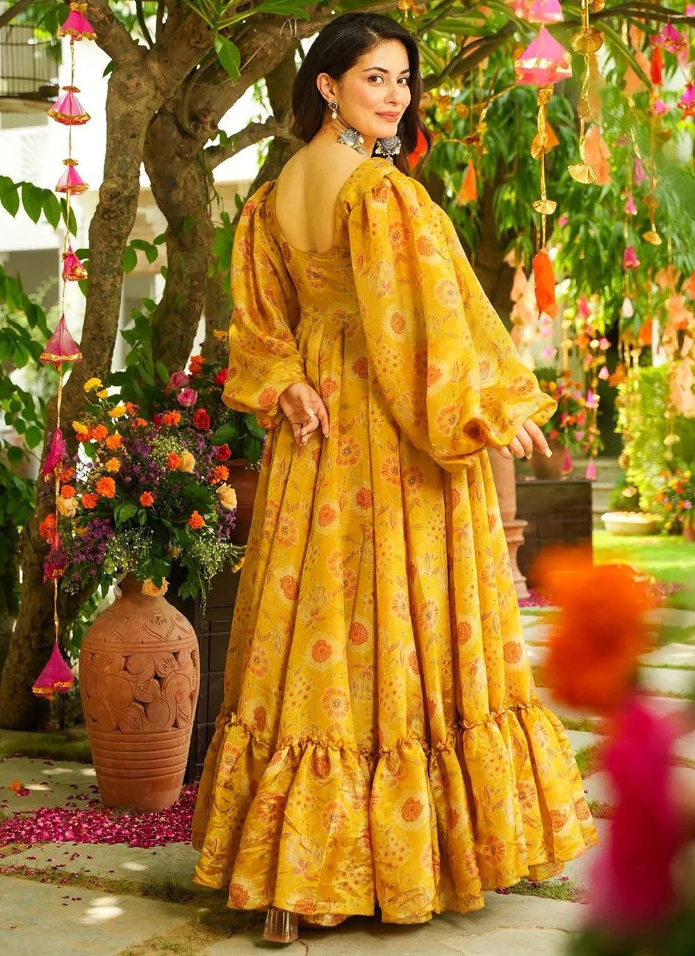 The Yellow Chinon Digital Printed Readymade Designer Gown blends contemporary design with traditional charm. Its flowing silhouette creates a flattering look, while the eye-catching digital prints add artistic beauty to the outfit.