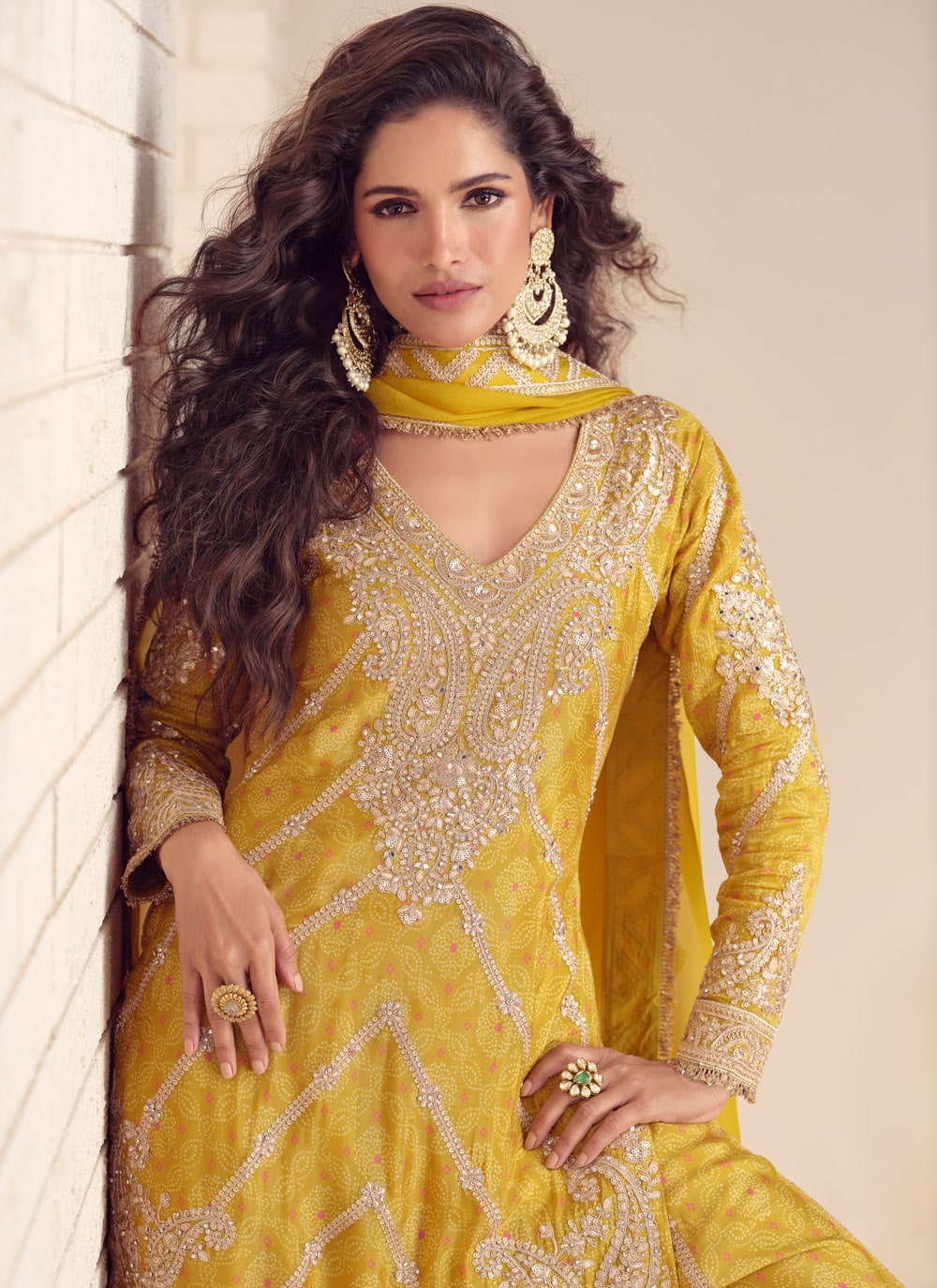 Brighten your festive wardrobe with this Yellow Chinon Salwar Suit, styled with digital prints, zari detailing, and shimmering sequins embroidery. A stunning designer piece for weddings, festive functions and cultural gatherings. Comes with matching bottom and dupatta.