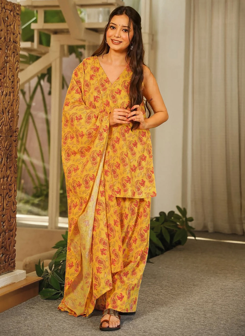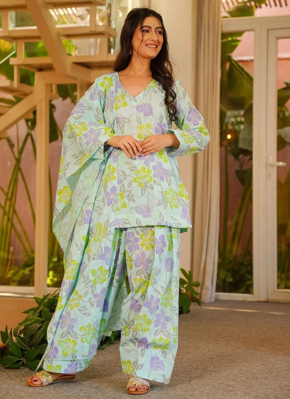 Designed to combine everyday comfort with stylish detailing, this Yellow Cotton Digital Printed Readymade Salwar Suit presents a charming ethnic look. The digital print design enhances the vibrant yellow tone. Comes with matching bottom and dupatta.