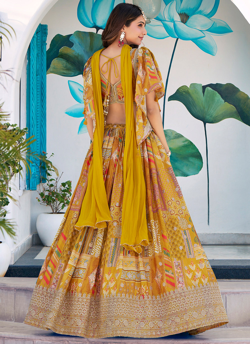 Celebrate vibrant tradition with this yellow Chinon lehenga choli, beautifully detailed with digital prints and rich zari and dori embroidery. Its bright hue and intricate craftsmanship make it a festive must-have for haldi or wedding events. Comes with matching choli and dupatta.