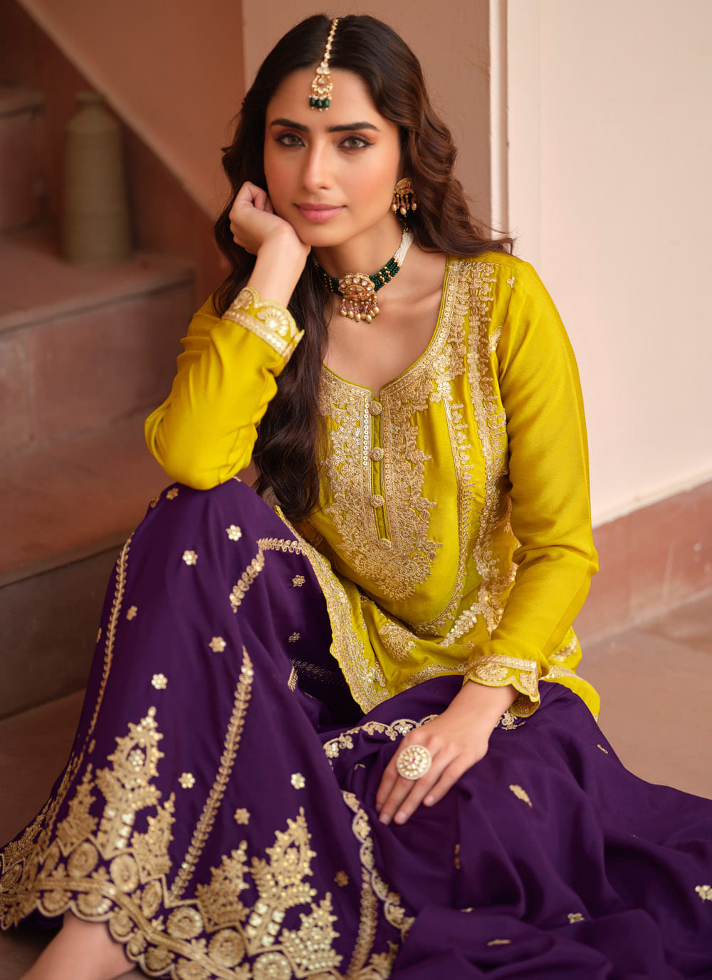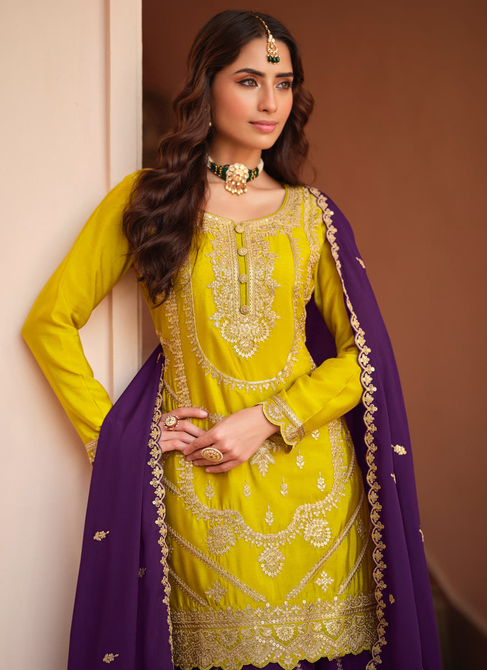 Perfect for festivals and special occasions, this chinon silk salwar kameez features refined embroidery and a flattering silhouette. Its bright yellow tone adds warmth and sophistication to your ethnic ensemble. Comes with matching bottom and dupatta.