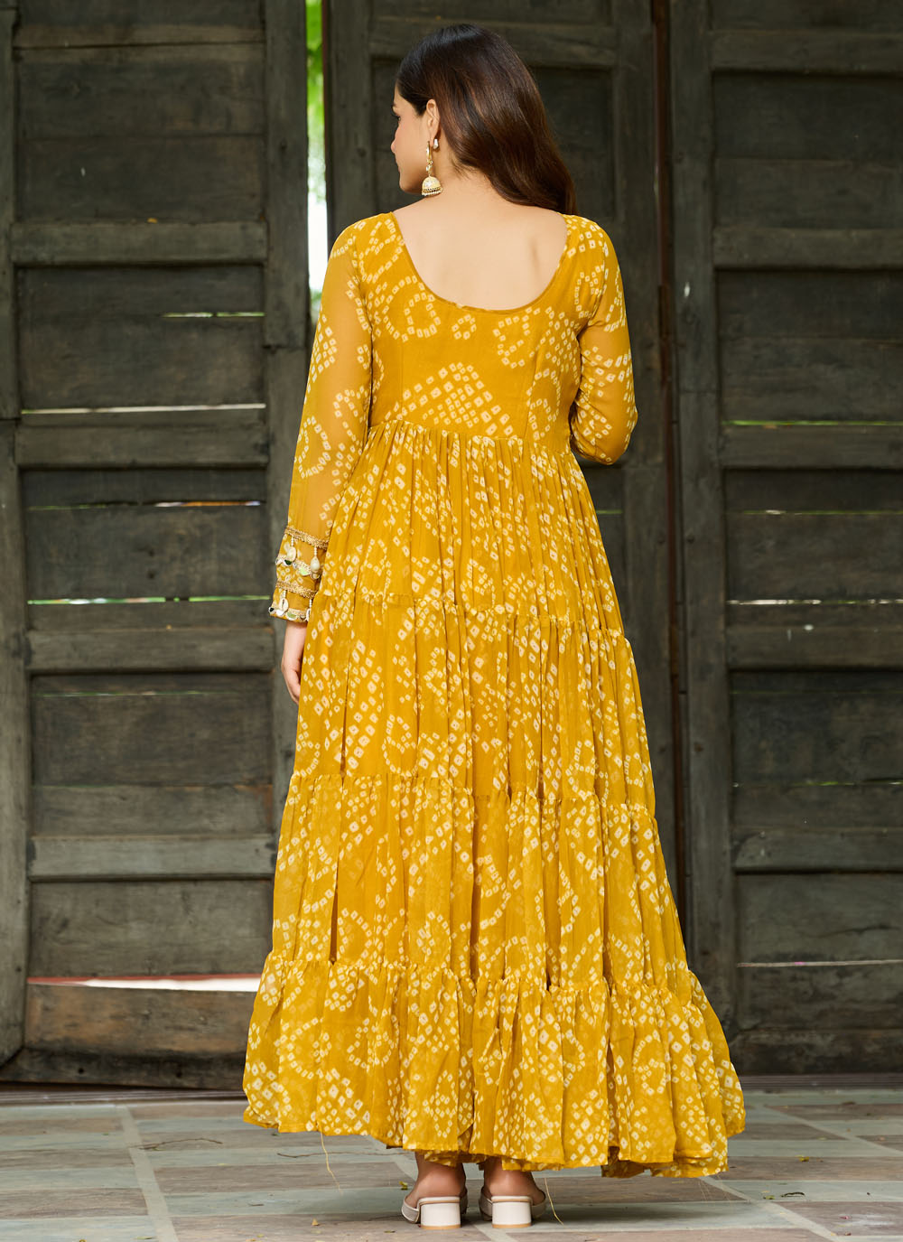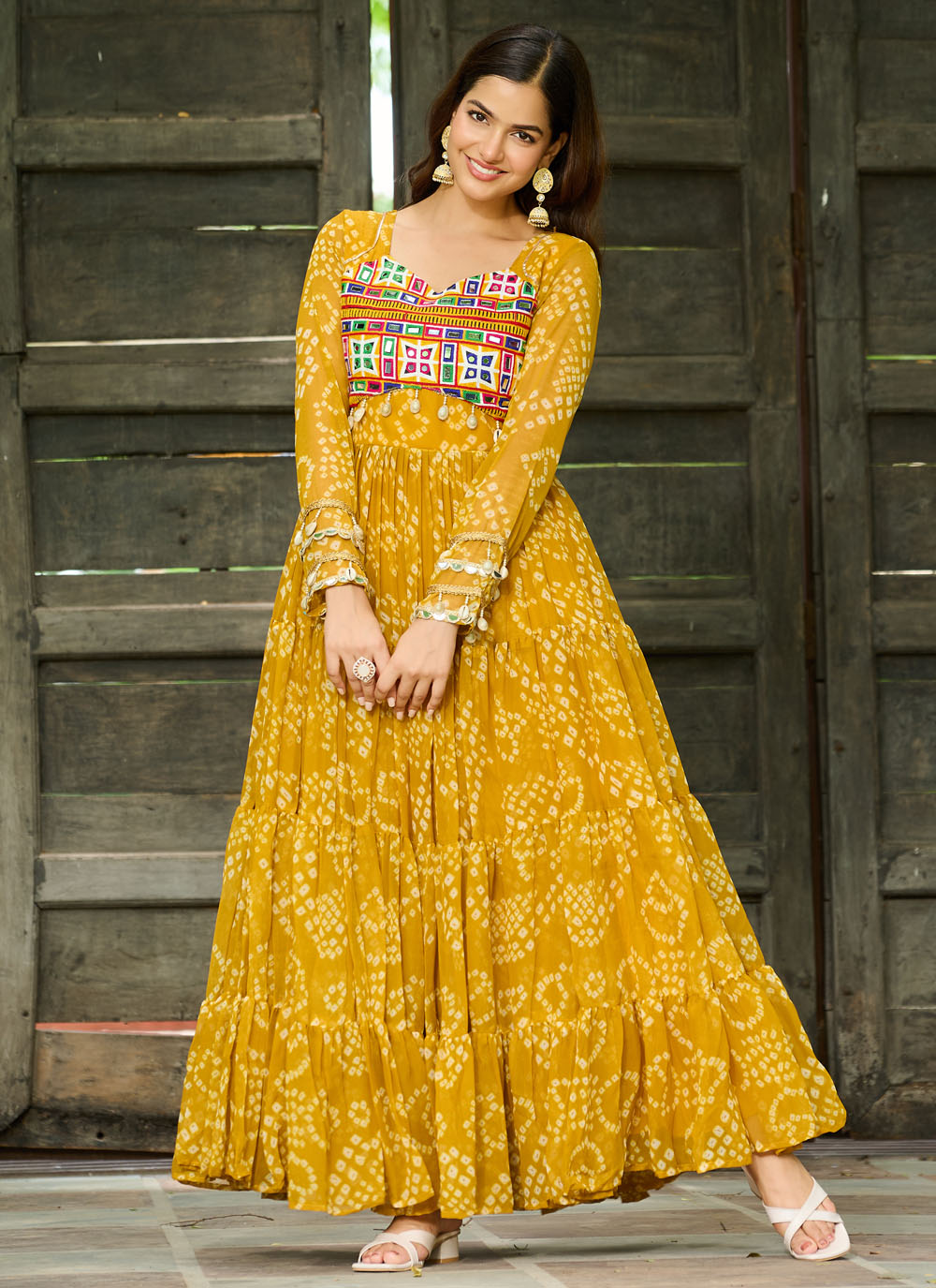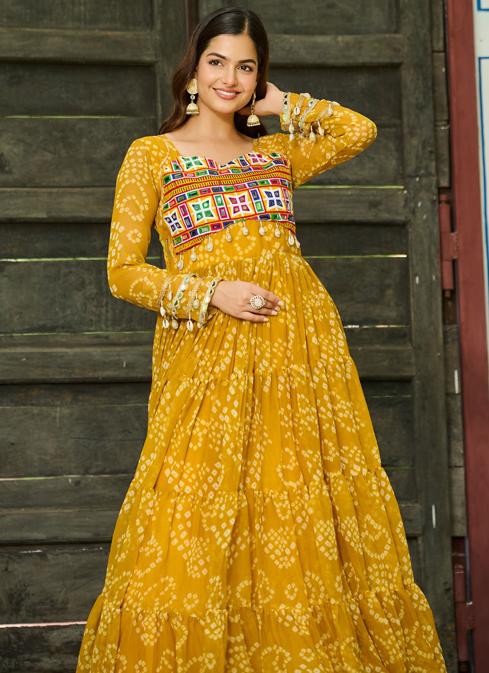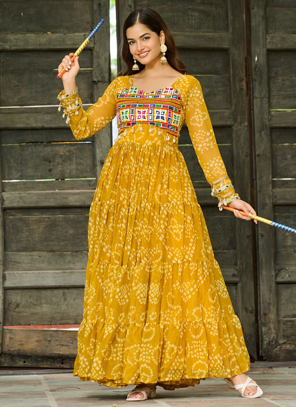Brighten up your festive moments with this Yellow Faux Georgette Gown, beautifully detailed with traditional Gamthi work and ethnic prints. Lightweight and vibrant, this gown is the perfect combination of comfort and cultural elegance for Navratri and functions.