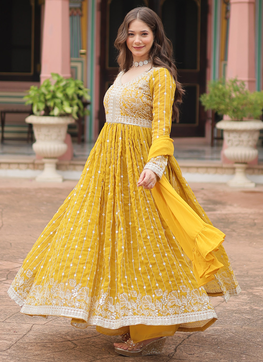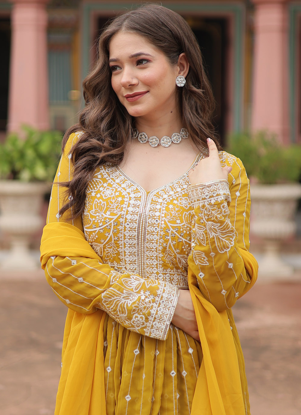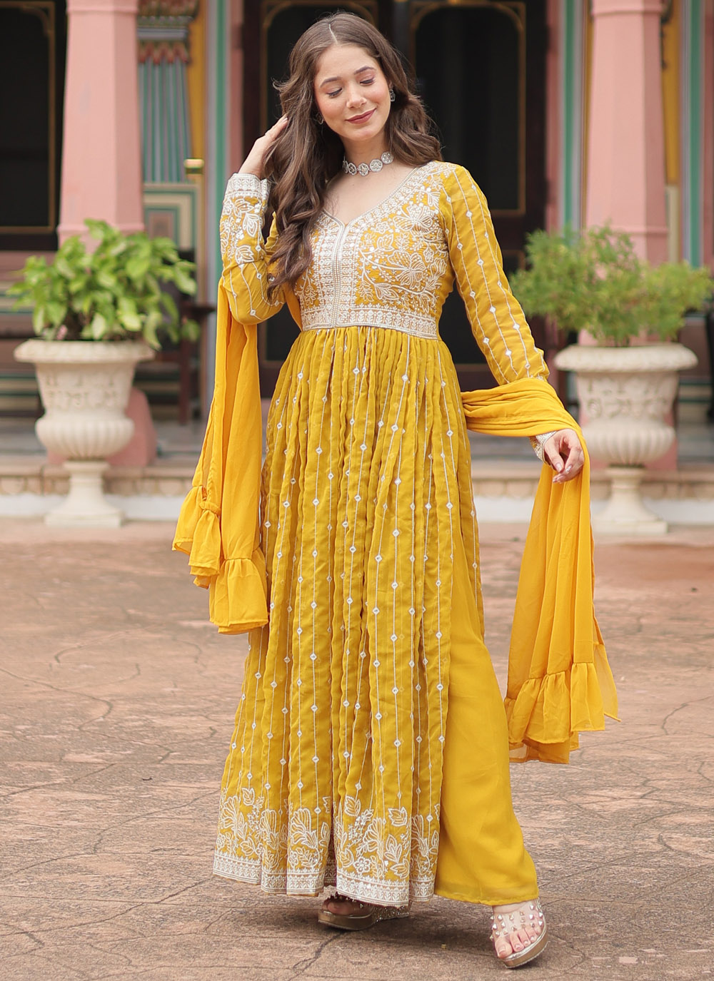 Designed for effortless elegance, this yellow faux georgette palazzo salwar suit showcases detailed thread embroidery with a soft and graceful drape. The bright yellow shade adds freshness, making it ideal for festive wear and special occasions. Comes with matching bottom and dupatta.