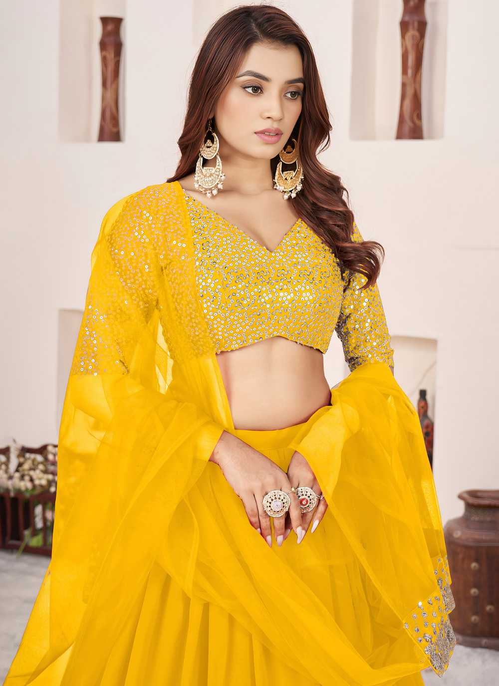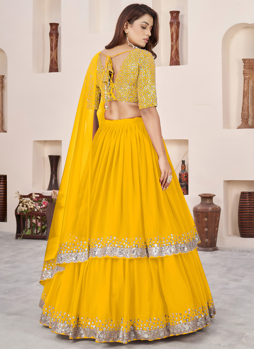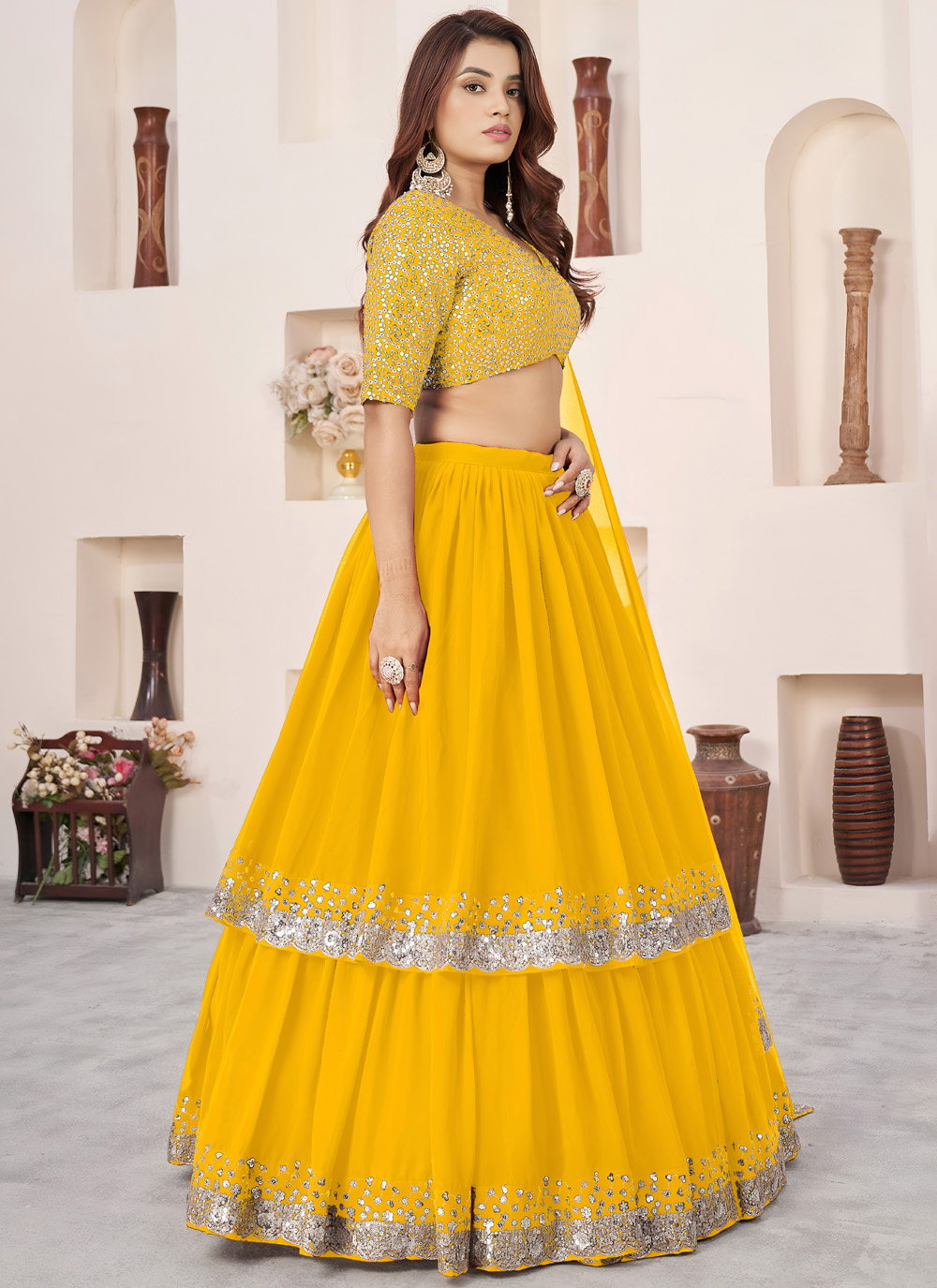 Designed for radiant festive looks, this yellow embroidered lehenga choli features shimmering sequins zari work that adds charm and brightness. Its flowy silhouette ensures comfort while enhancing its designer appeal. Comes with matching choli and dupatta.