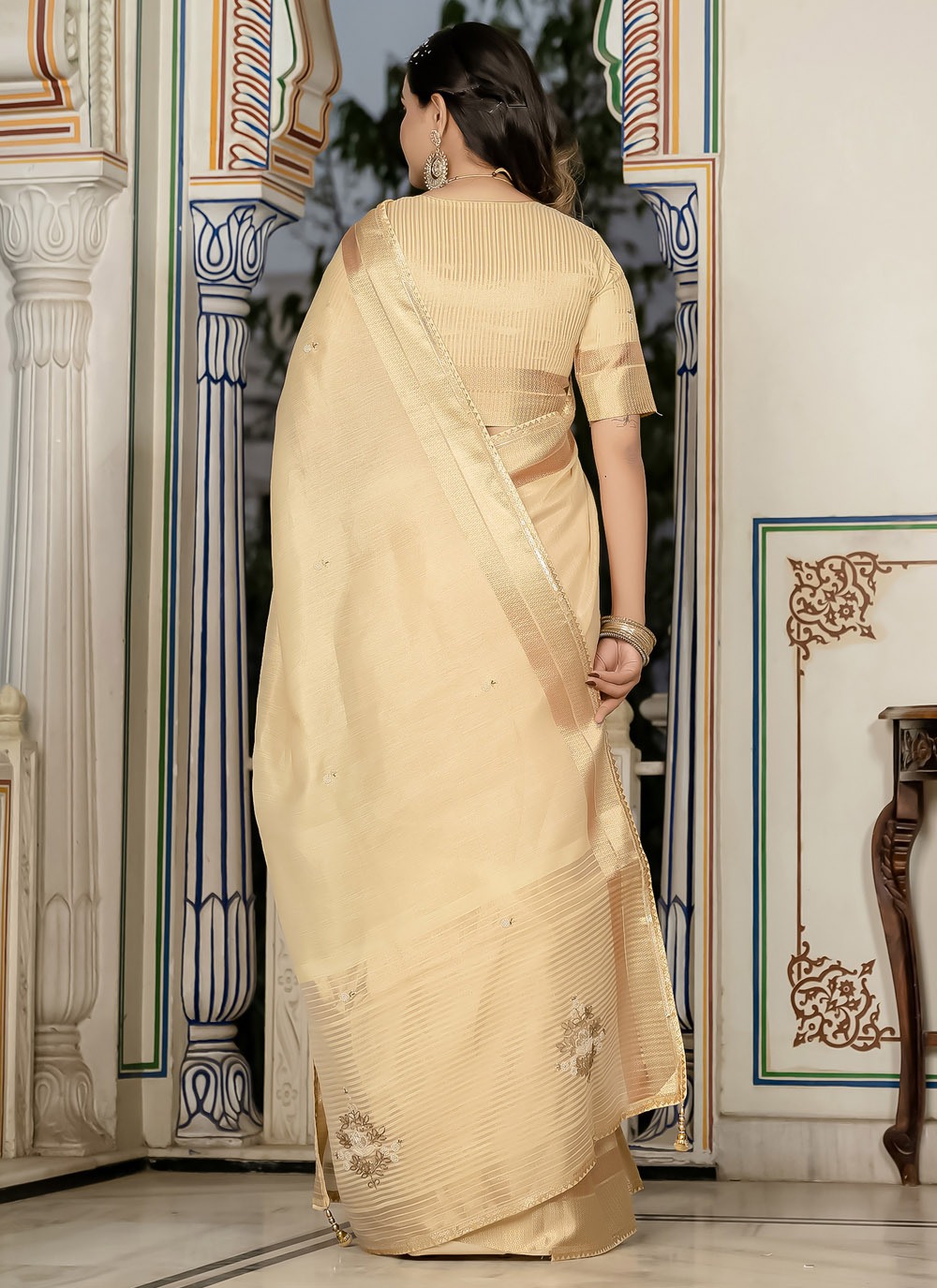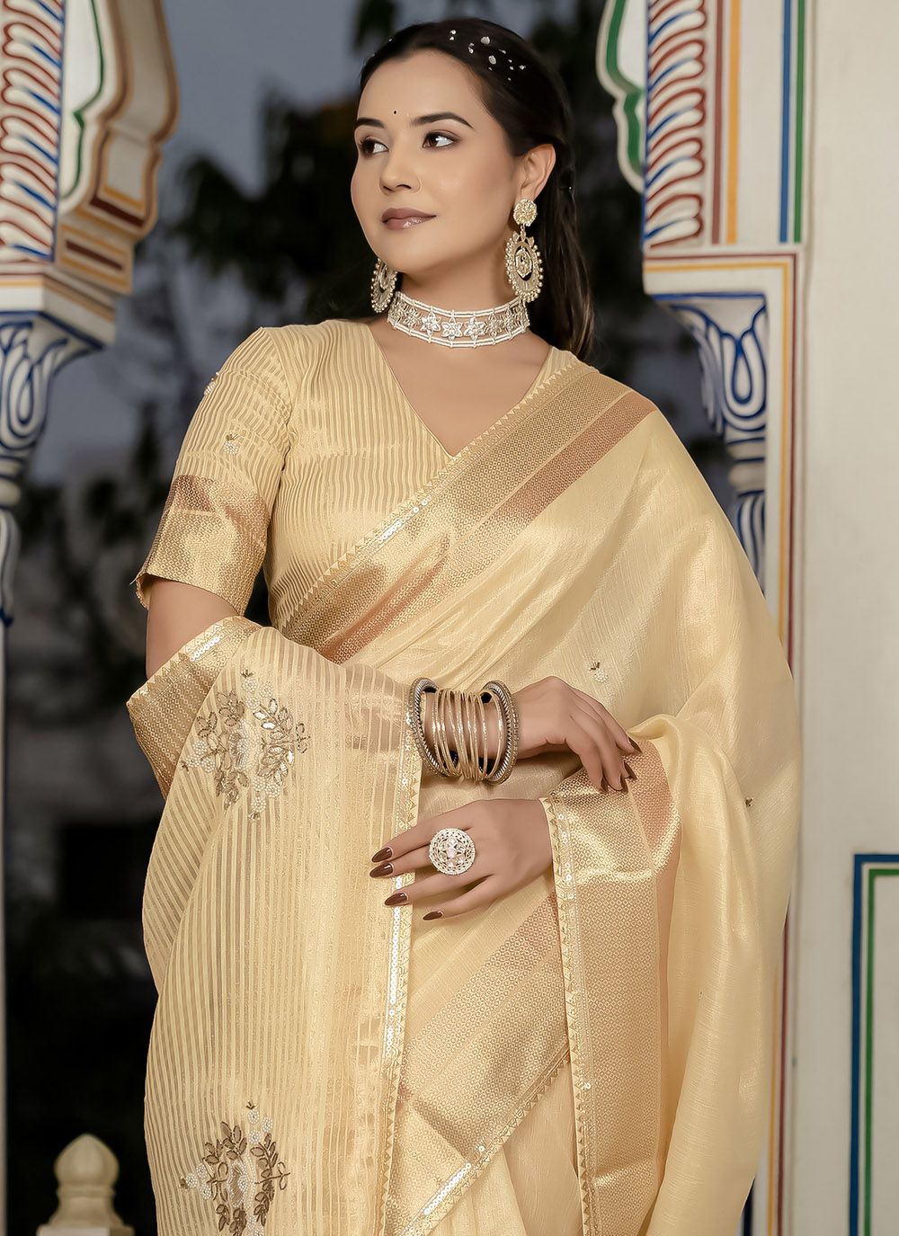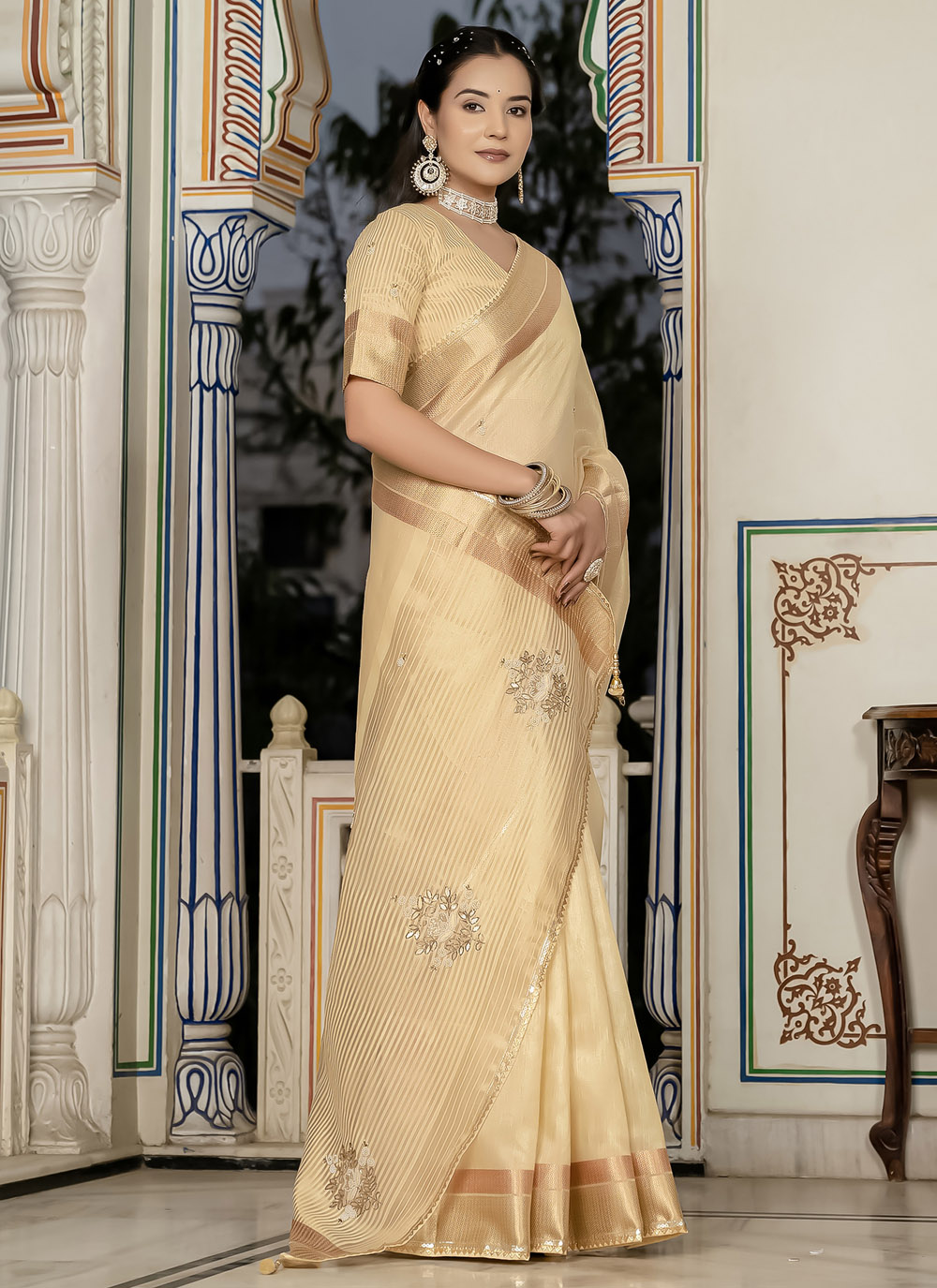 This vibrant yellow tissue linen saree showcases beautiful khatli craftsmanship, fine booti designs, and rich zari detailing along the borders and pallu. Ideal for festivals, weddings and cultural gatherings. Comes with matching blouse.