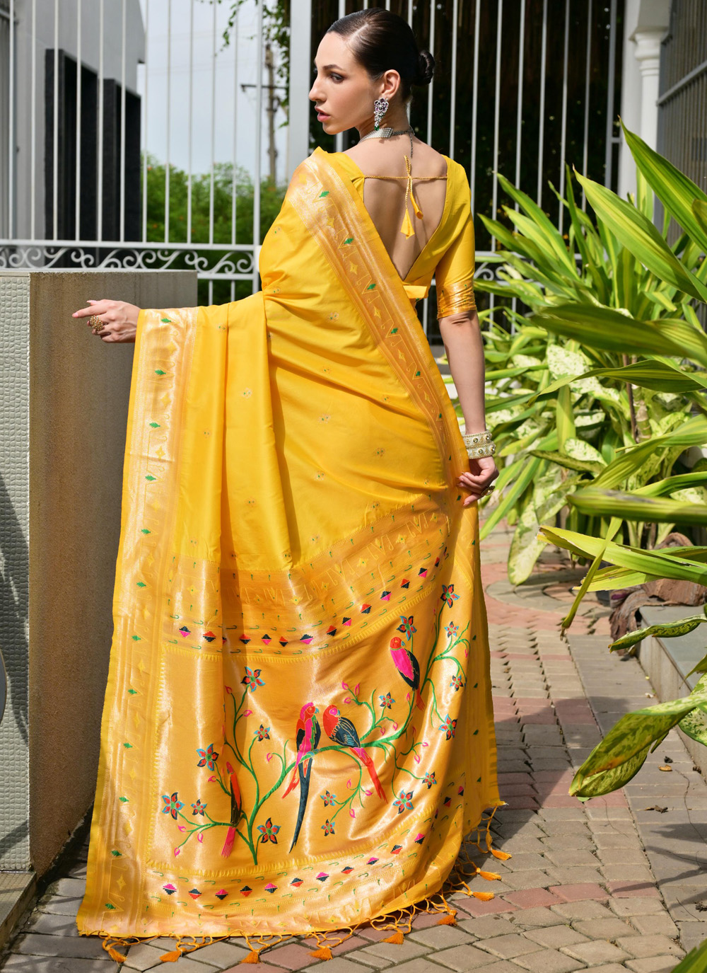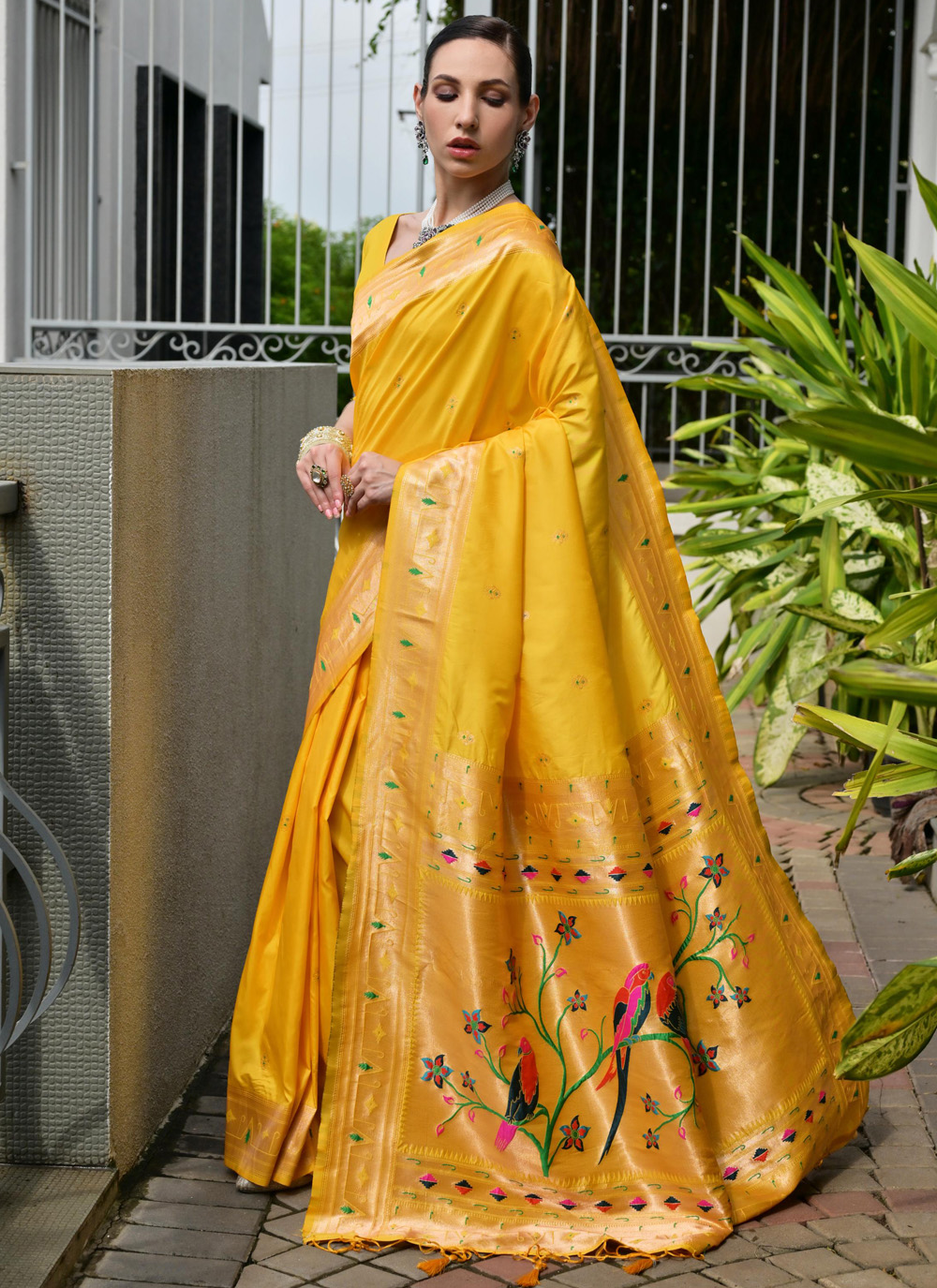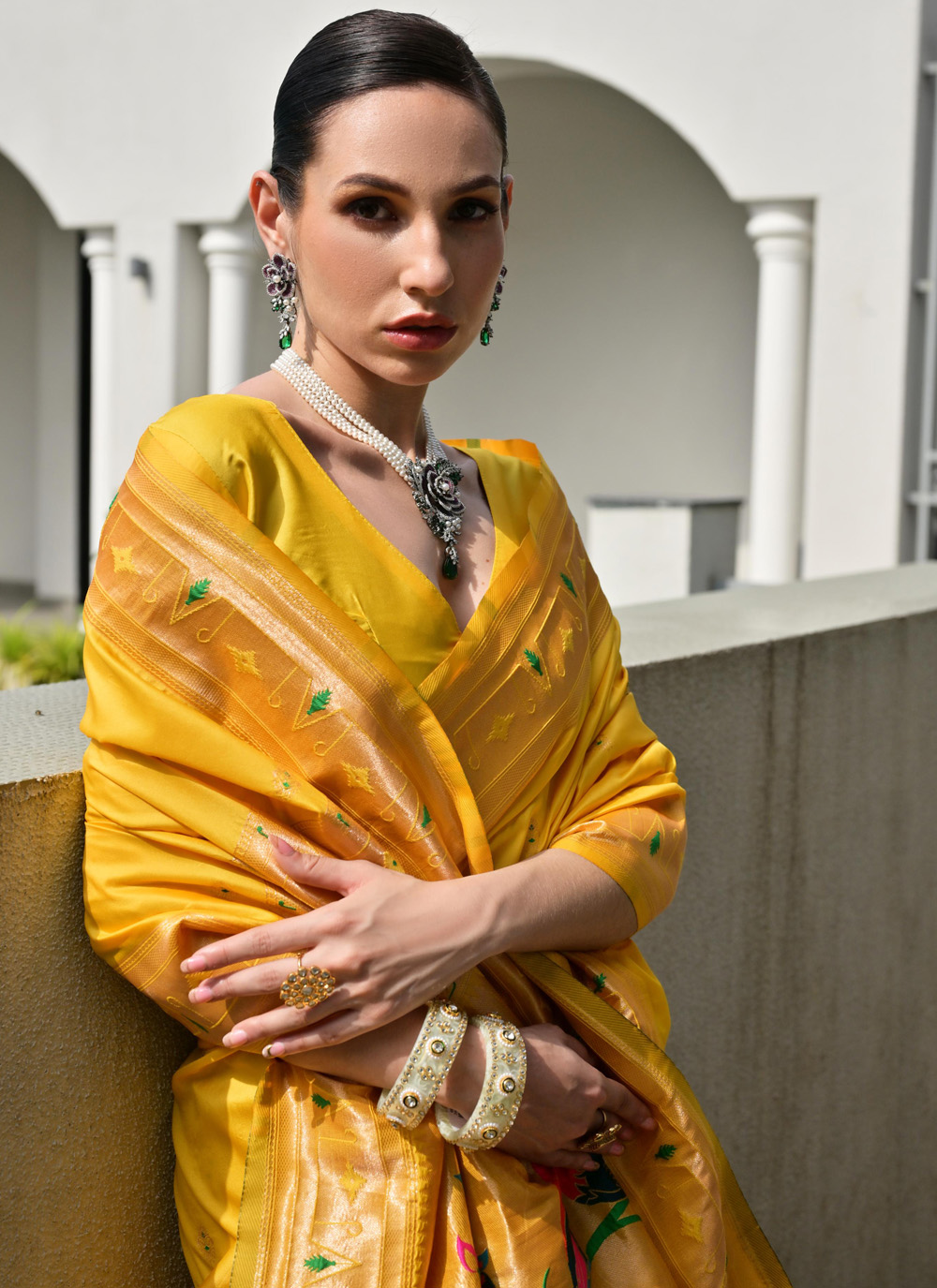 This ceremonial yellow Banarasi silk saree blends traditional artistry with rich colour. The fine zari weaving and meenakari work deliver a graceful drape ideal for religious functions and cultural events. Comes with matching blouse.