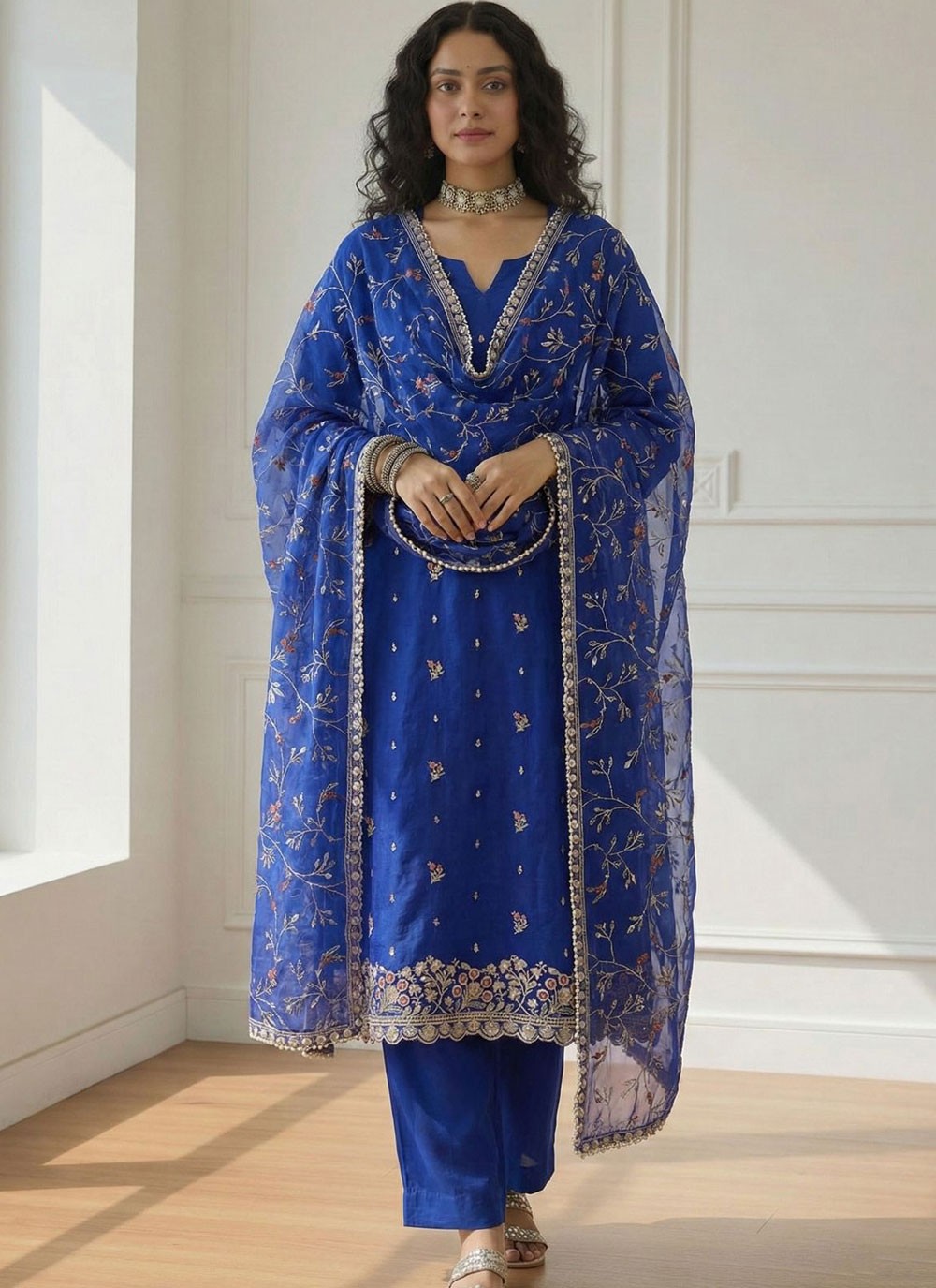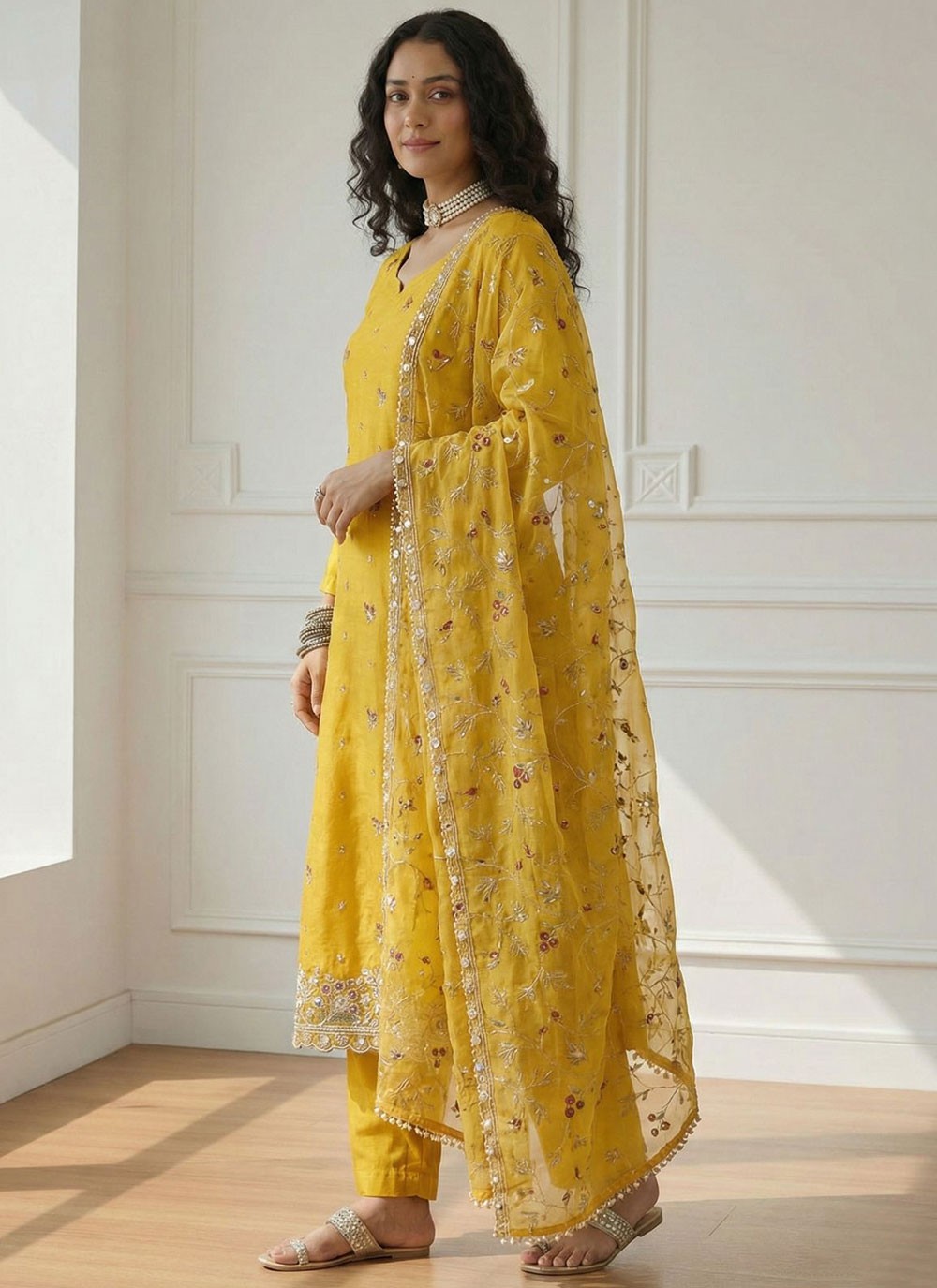 Crafted in premium organza, this yellow salwar kameez features delicate embroidered detailing that enhances its refined appearance. The soft sheen and airy texture make it perfect for ceremonial gatherings and festive occasions. Comes with matching bottom and dupatta.