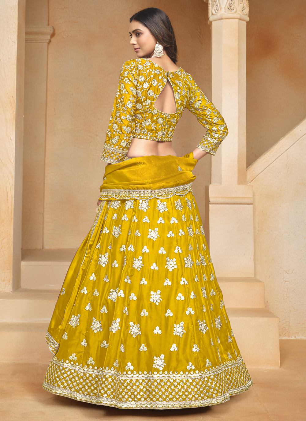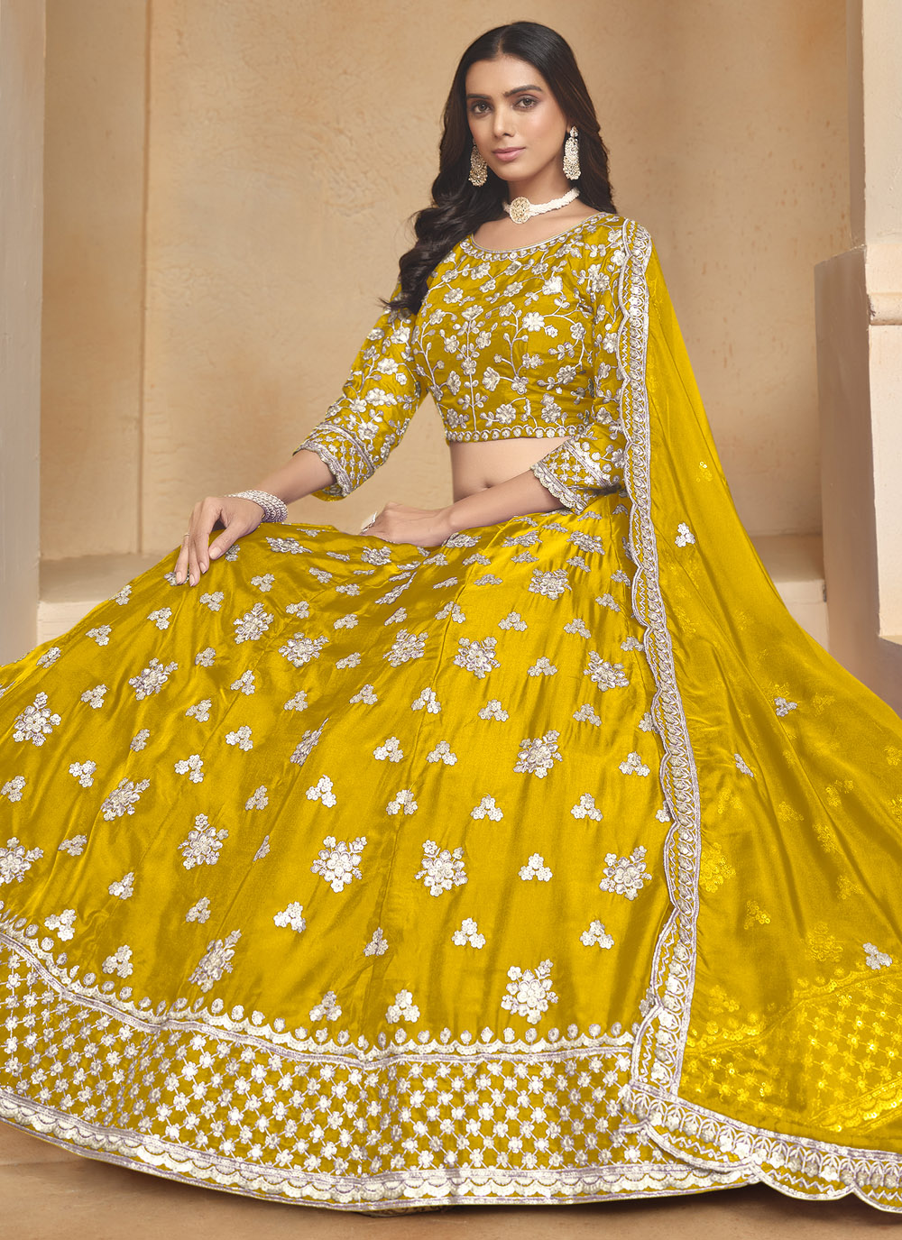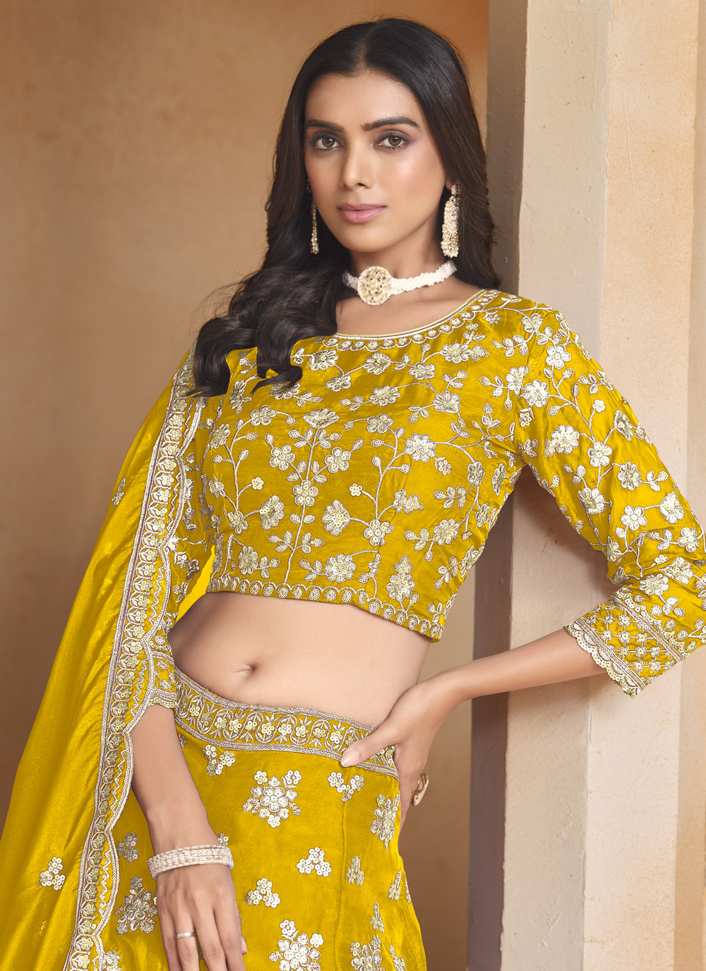 This ceremonial lehenga choli in bright yellow organza is a celebration of detailed craftsmanship. The shimmering sequins and delicate thread embroidery come together to create a traditional outfit with modern appeal. Comes with matching choli and dupatta.